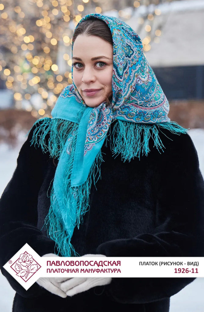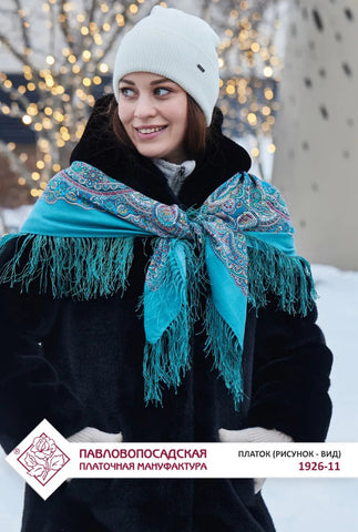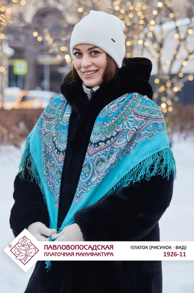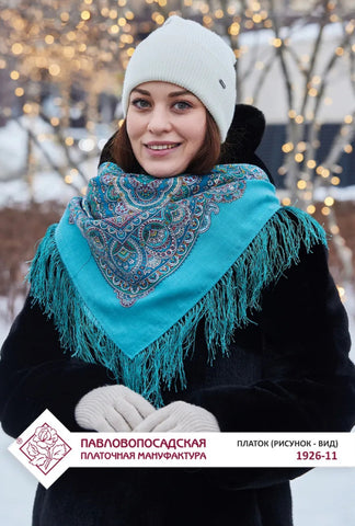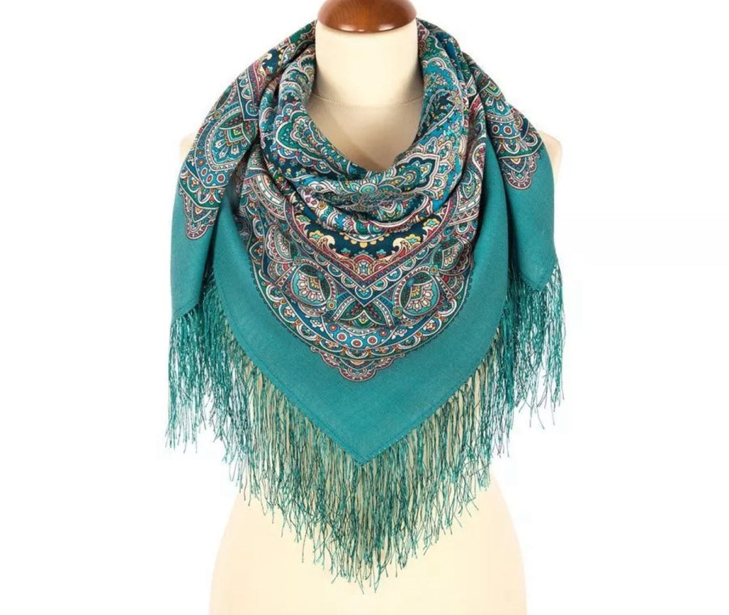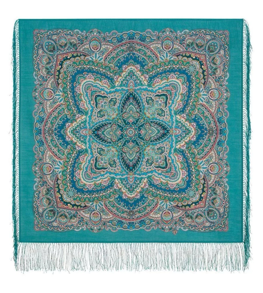This 35'' square scarf is made of merino wool by the brand Pavlovo Posad, featuring a traditional Russian design from 1926. The scarf is adorned with a floral pattern in mint-turquoise, red, green, yellow, and blue colors, depicting leaves and flowers. It includes silky fringe accents and can be styled as a shawl, wrap, neck warmer, or stole, making it a versatile accessory for any season.