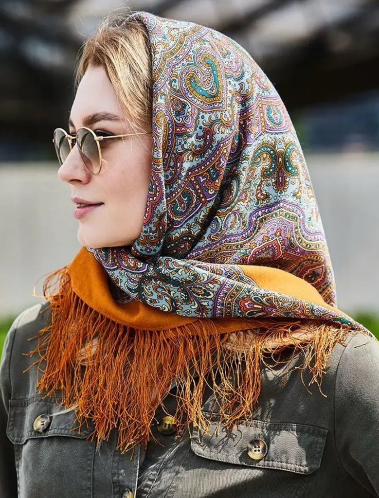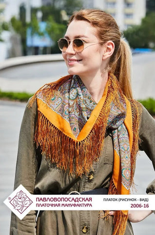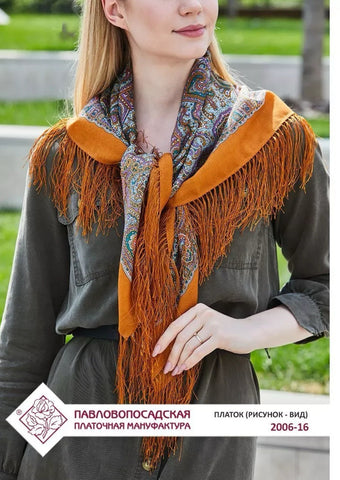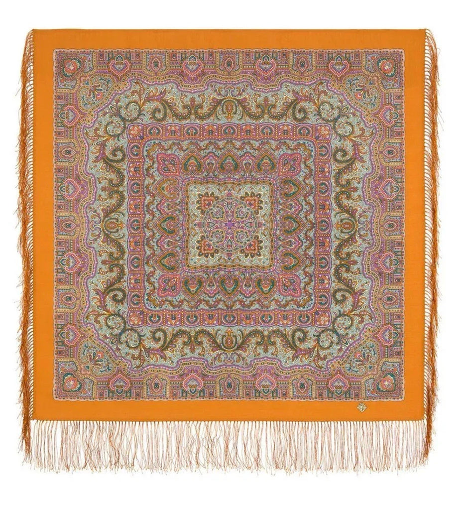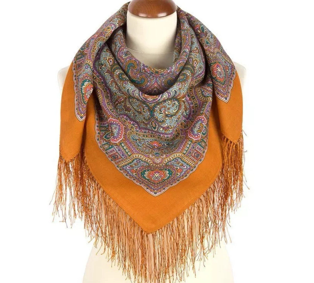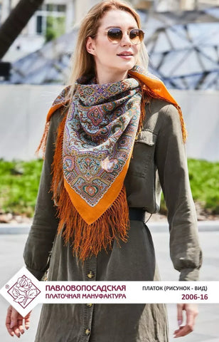 Wrap yourself in the warmth and elegance of this Pavlovo Posad square scarf, a versatile addition to any wardrobe. With its rich orange, purple, and pale blue palette, the scarf is as vibrant as it is functional. The luxurious merino wool fabric ensures comfort and durability, making it an ideal choice for any season – from the brisk fall and spring days to chilly winter evenings.