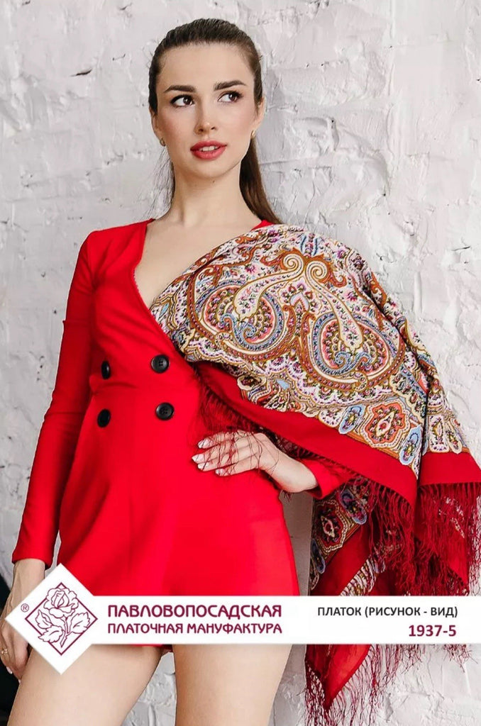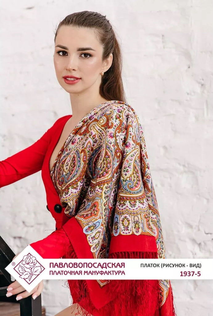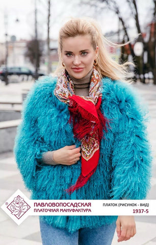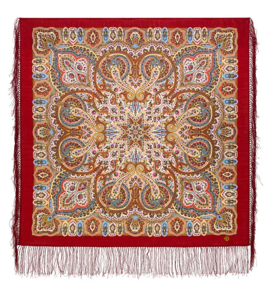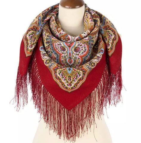 Wrap yourself in the timeless elegance of the Pavlovo Posad 35'' square scarf, a versatile piece that adds a touch of nature-inspired beauty to any ensemble. Crafted from luxurious merino wool, this soft and cozy scarf features a vibrant mix of red, beige, and light blue tones, complemented by an exquisite floral pattern that evokes the essence of spring and summer blooms, leaves, and vines.