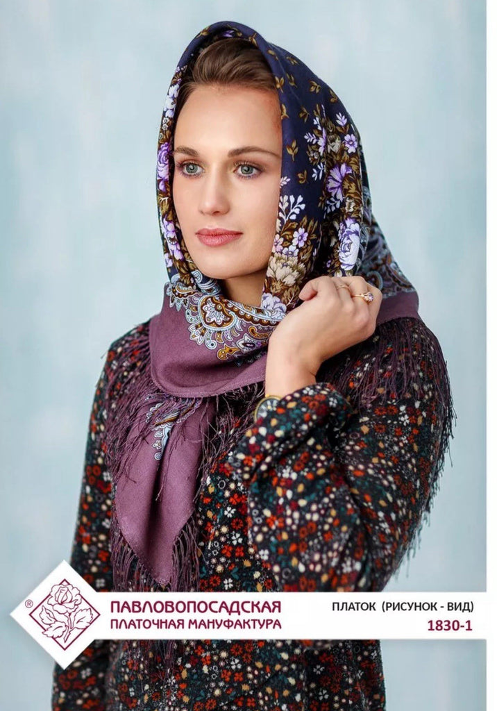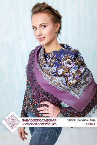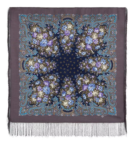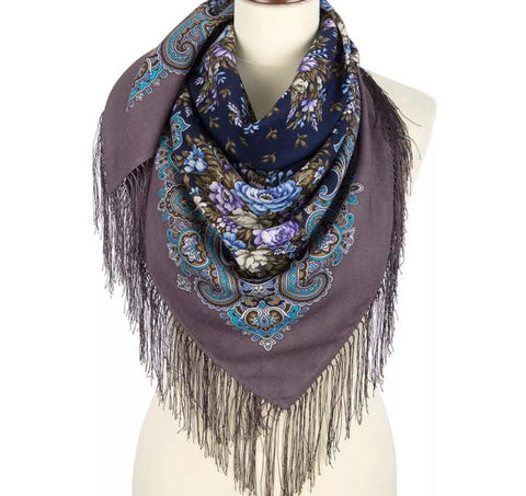 This 35'' square scarf is made of traditional Russian Merino wool by the brand Pavlovo Posad. The scarf features a floral pattern with leaves and flowers in dark and light purple, dark and light blueand beige hues, capturing a nature theme. Accented with a silky fringe, this versatile scarf can be worn as a shawl, wrap, neck warmer, stole, or traditional scarf, making it suitable for all seasons. The intricate design titled "Dushistiy lug 1830-9" adds a touch of elegance to any outfit, while the dry clean only care instructions ensure its longevity. Looking for the