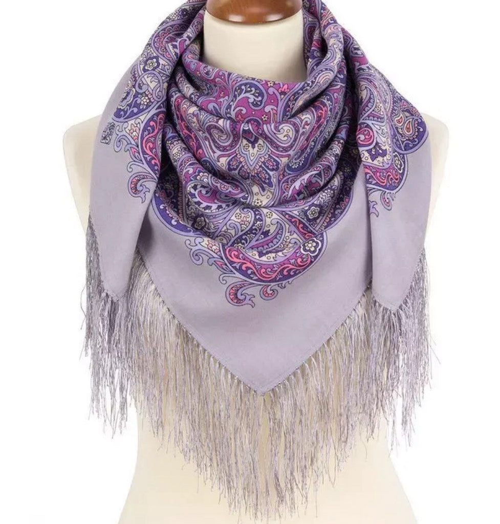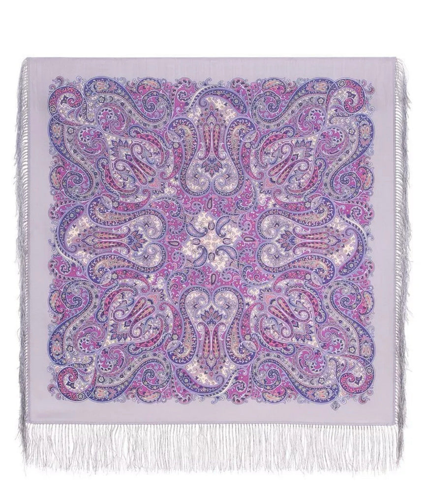 Wrap yourself in the timeless elegance of the Pavlovo Posad 35'' square cozy and soft scarf, a versatile and luxurious addition to any wardrobe. Crafted from premium merino wool, this scarf features a stunning floral pattern with a harmonious blend of purple, violet, gray, and pink tones, celebrating the beauty of nature and the classic Russian art of scarf-making.
