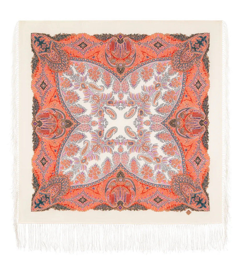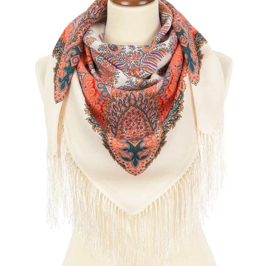 Wrap yourself in the timeless elegance of the Pavlovo Posad 35'' square scarf, a versatile addition to any wardrobe. Crafted from the finest merino wool, this scarf boasts a stunning mix of ivory and salmon orange hues, adorned with a delicate floral pattern that evokes the beauty of nature. The scarf's multifunctional design allows it to be worn as a shawl, wrap, neck warmer, or stole, making it an essential accessory for any season.