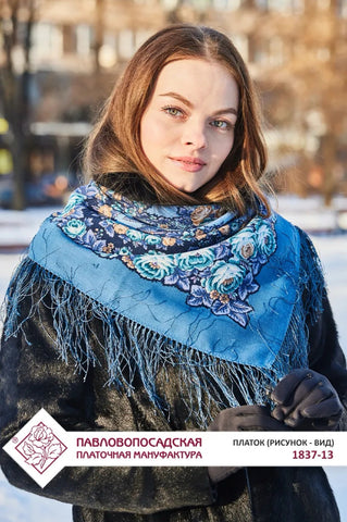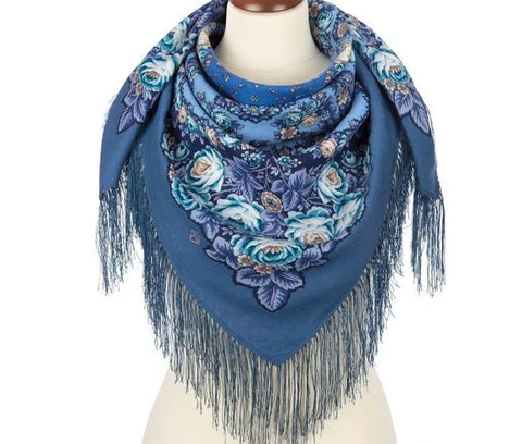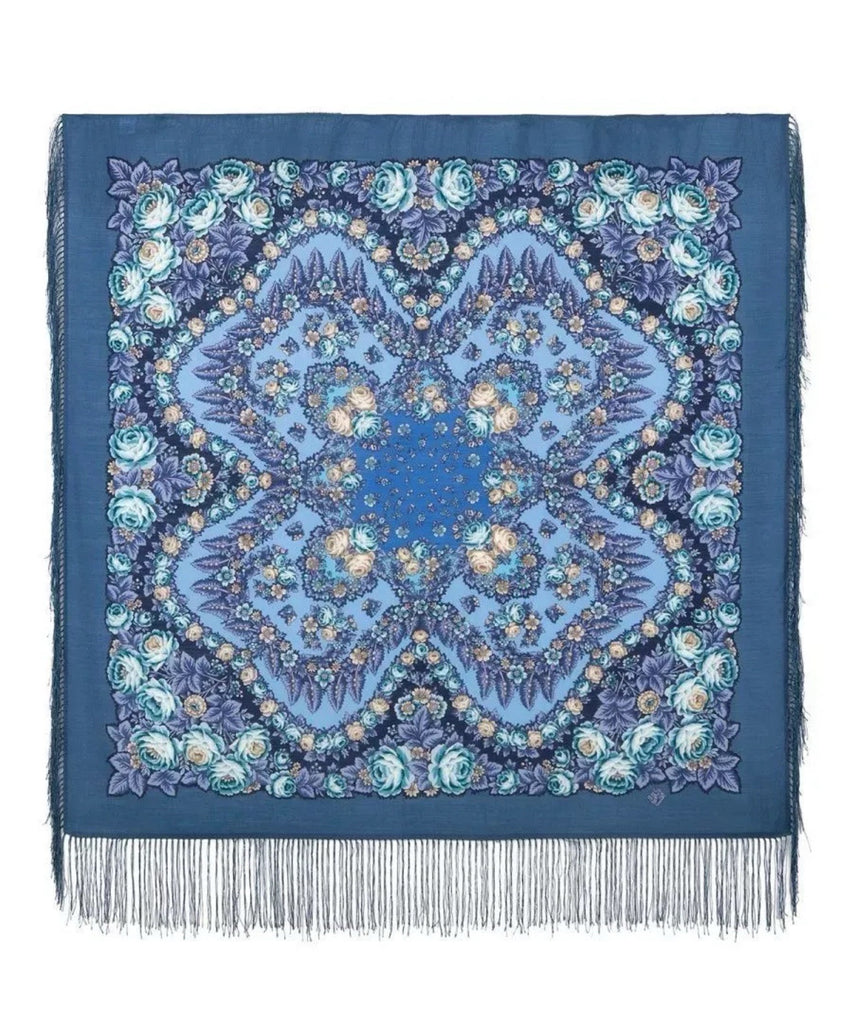 Wrap yourself in the timeless elegance of the Pavlovo Posad 1837 scarf, a versatile piece that adds a touch of nature-inspired beauty to any ensemble. Crafted from luxurious 100% merino wool, this square-shaped scarf boasts a stunning floral pattern with intricate Slavic roses, rendered in a captivating array of hues including blue, blueish green, turquoise, and pale yellow. The design is complemented by the scarf's silky fringe, lending an extra layer of sophistication.
