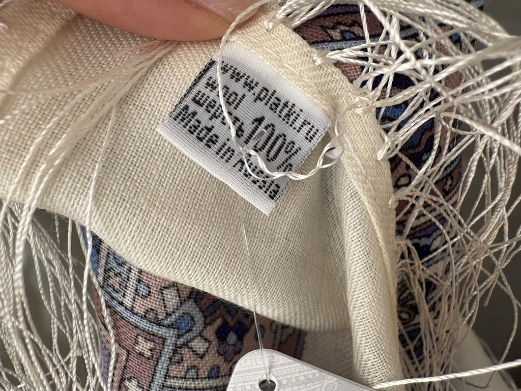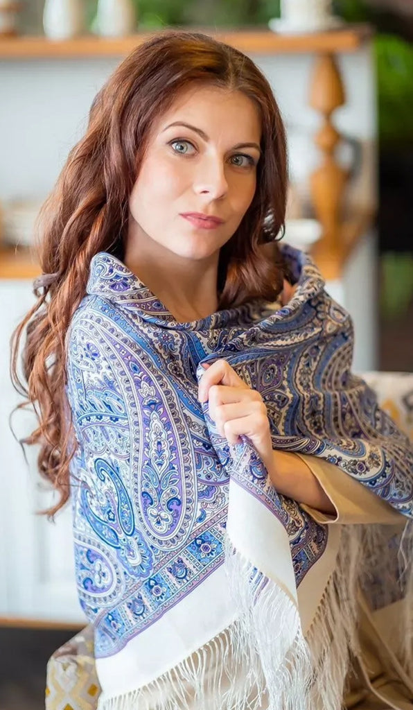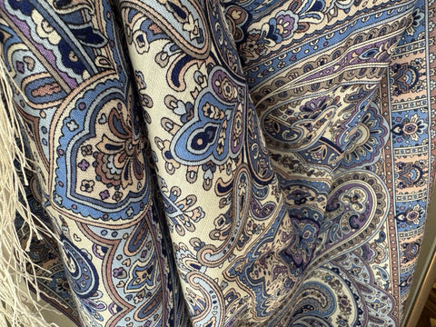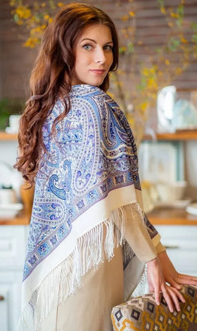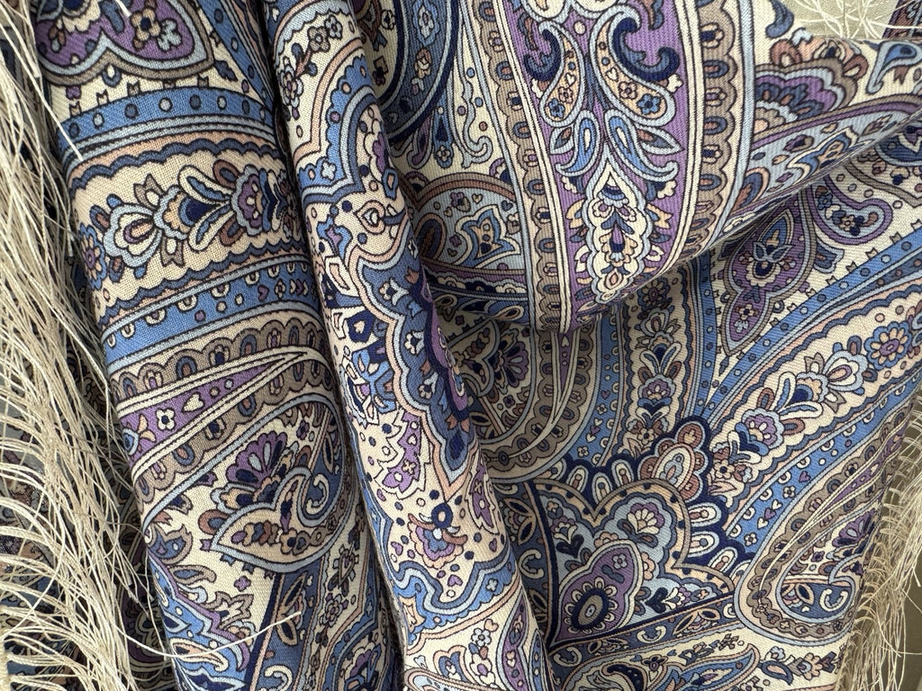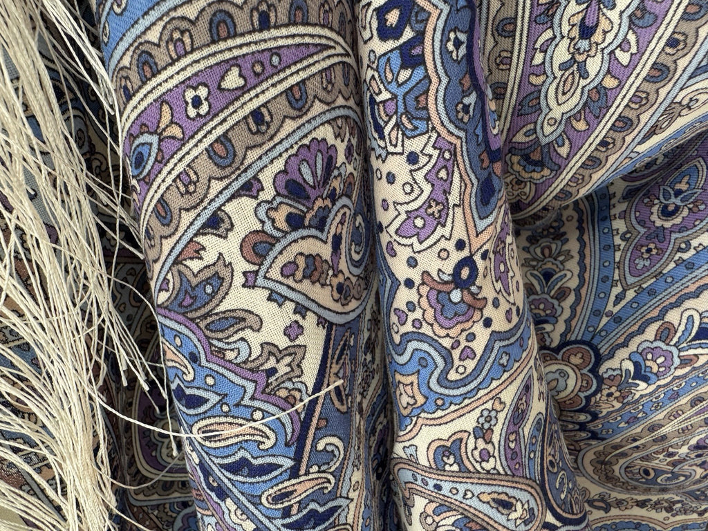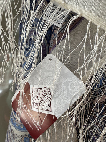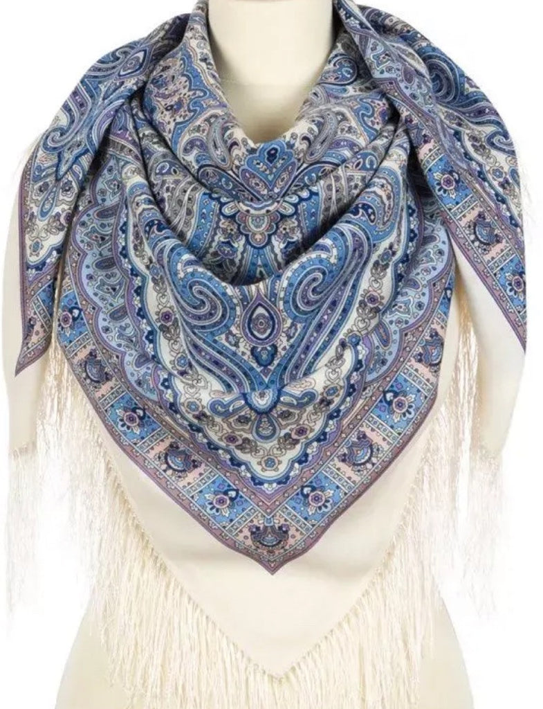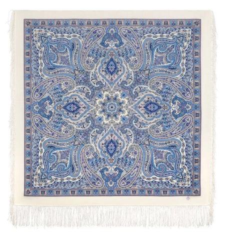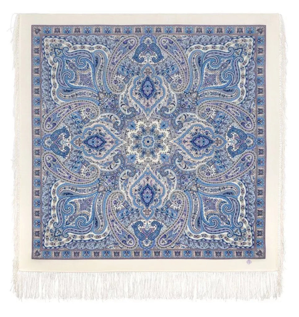 This 43" square scarf by Pavlovo Posad features a delicate floral pattern in light blue, beige, and creamy white colors, crafted from high-quality Merino wool. The scarf can be styled in various ways, such as a head scarf, shawl, neck warmer, or stole, making it a versatile accessory for all seasons. With intricate accents like fringe detailing, this Russian-made scarf titled "Shelkovie travi 1894-4" exudes a natural and elegant aesthetic, perfect for women looking to add a touch of sophistication to their outfit. Upgrade your spring style with our Scarves and Stoles from Pavlovo Posad, the famous Russian brand since the 19th century. With a dry clean only care instruction, this scarf is versatile and can be worn as a neck warmer in winter or as a stylish addition to your outfit in the summer, fall, and spring seasons. Perfect for adding a touch of modern elegance to any look.