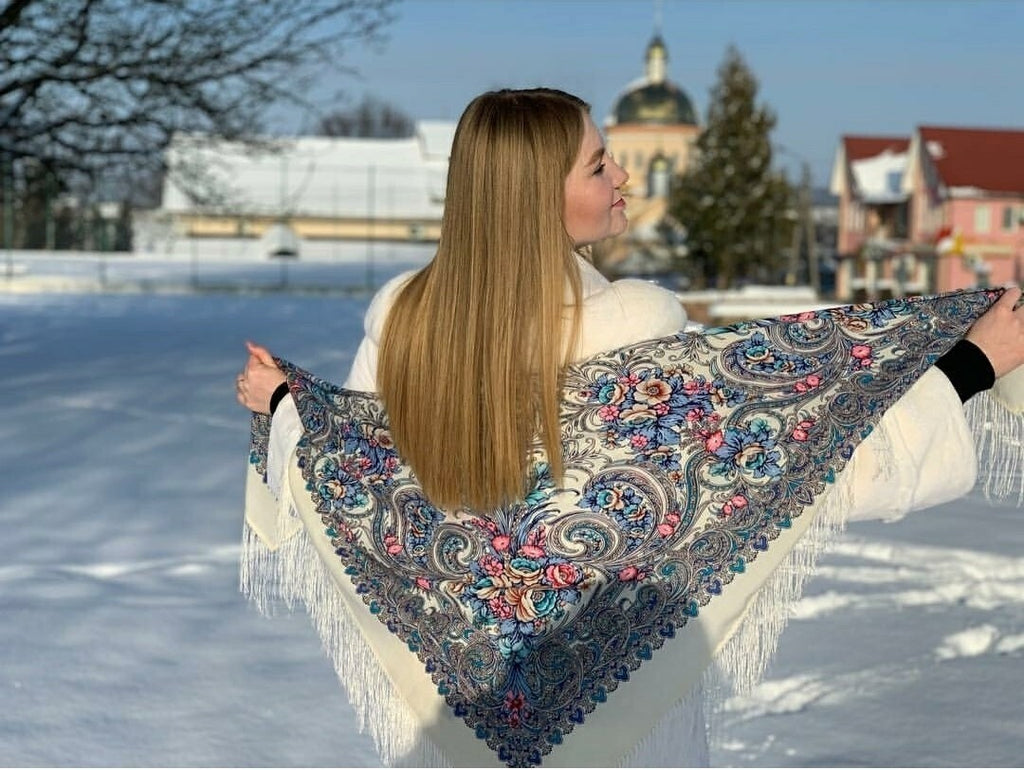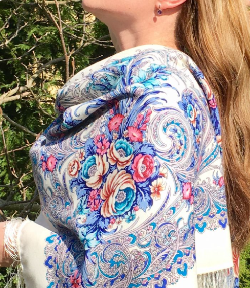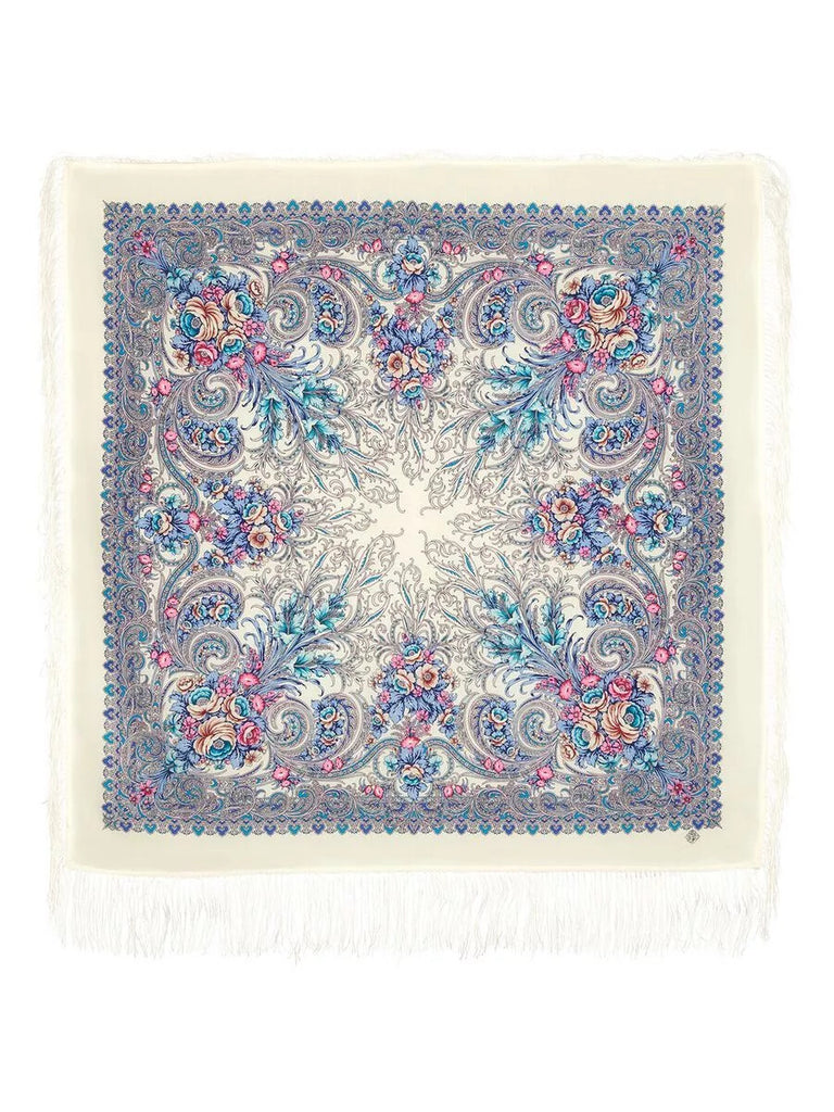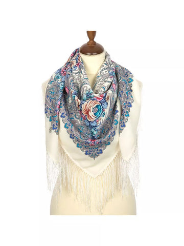This 43" square scarf by Pavlovo Posad features a delicate floral pattern in blue shades, pink, orange and creamy white colors, crafted from high-quality Merino wool. The scarf can be styled in various ways, such as a head scarf, shawl, neck warmer, or stole, making it a versatile accessory for all seasons. With intricate accents like fringe detailing, this Russian-made scarf titled "March" exudes a natural and elegant aesthetic, perfect for women looking to add a touch of sophistication to their outfit. Upgrade your spring style with our Scarves and Stoles from Pavlovo Posad, the famous Russian brand since the 19th century. With a dry clean only care instruction, this scarf is versatile and can be worn as a neck warmer in winter or as a stylish addition to your outfit in the summer, fall, and spring seasons. Perfect for adding a touch of modern elegance to any look.