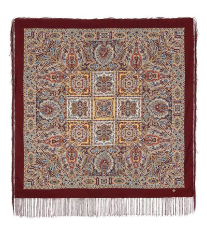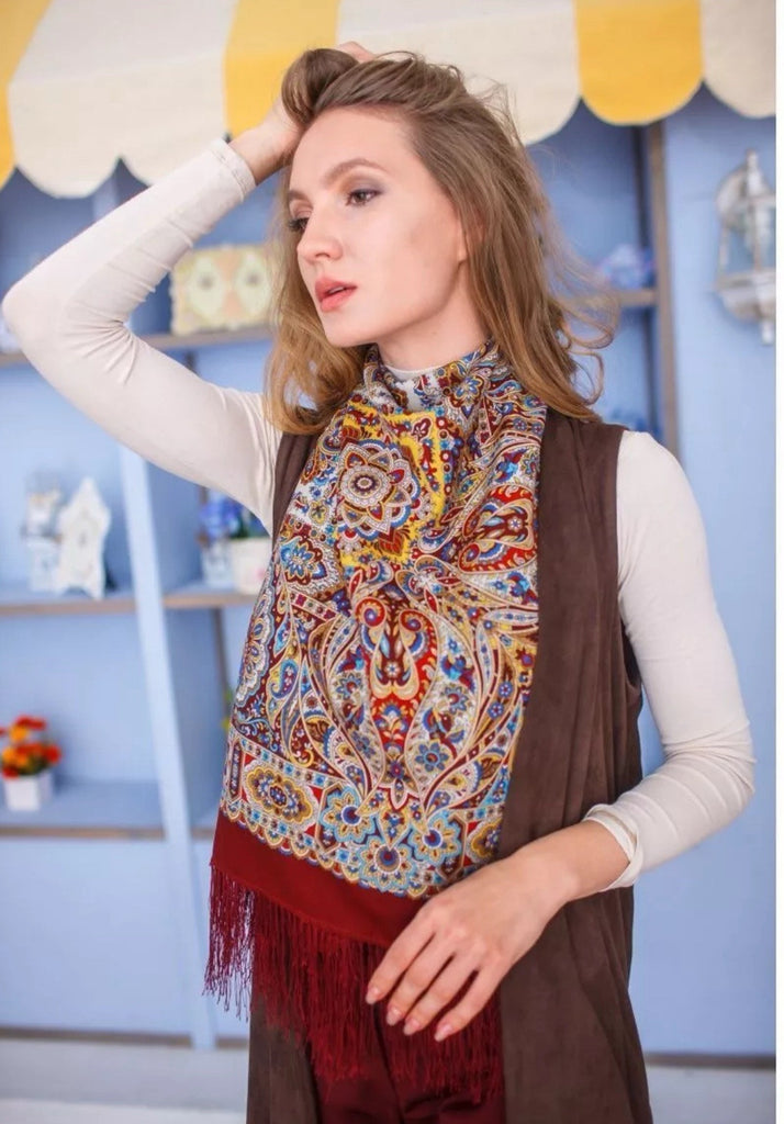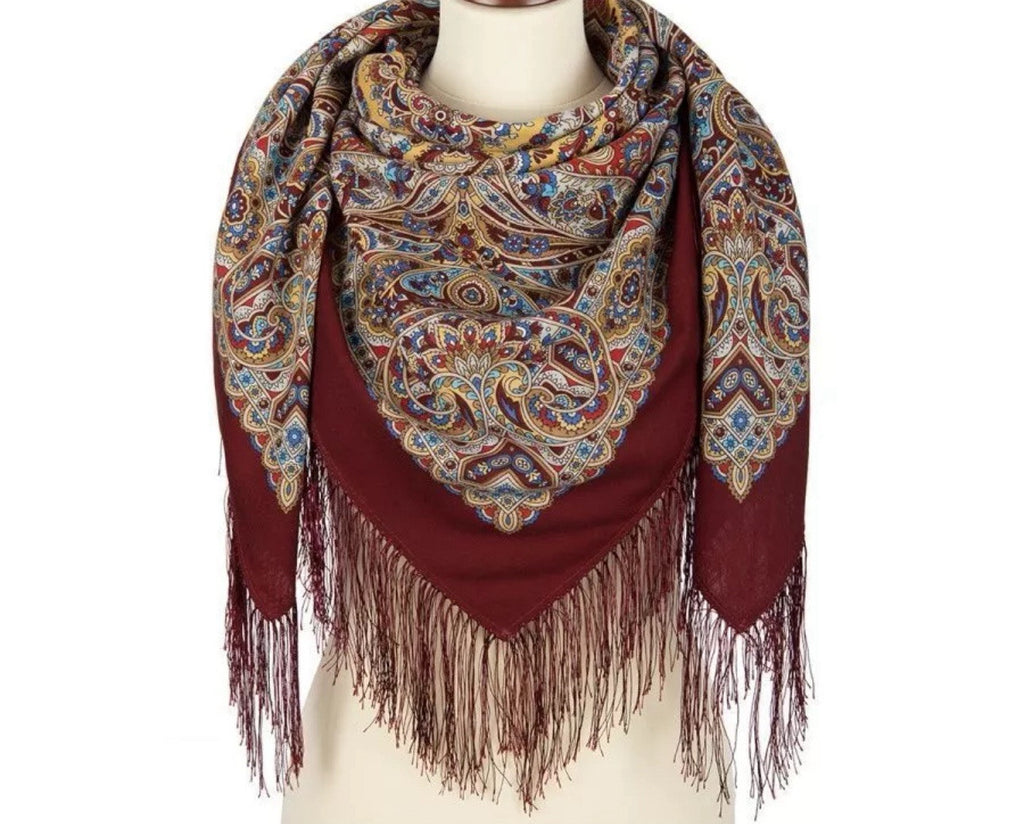 Wrap yourself in the timeless elegance of the Pavlovo Posad 43” Scarf, a versatile piece that transcends seasons. Crafted from luxurious merino wool, this scarf showcases a stunning peacock pattern with rich burgundy wine red, red, and yellow tones, accented with a chic fringe. Its multifunctional design serves as a neck warmer, head scarf, shawl, and stole, perfect for year-round style and warmth.