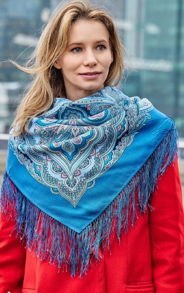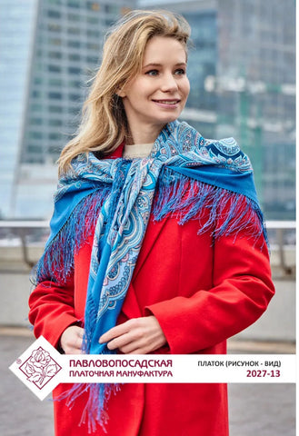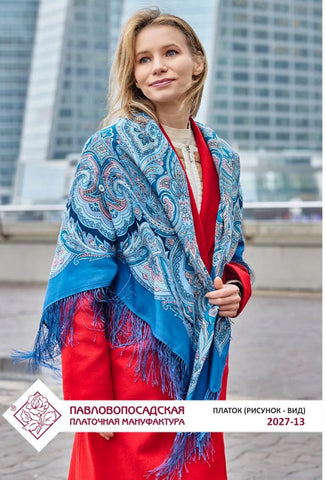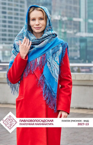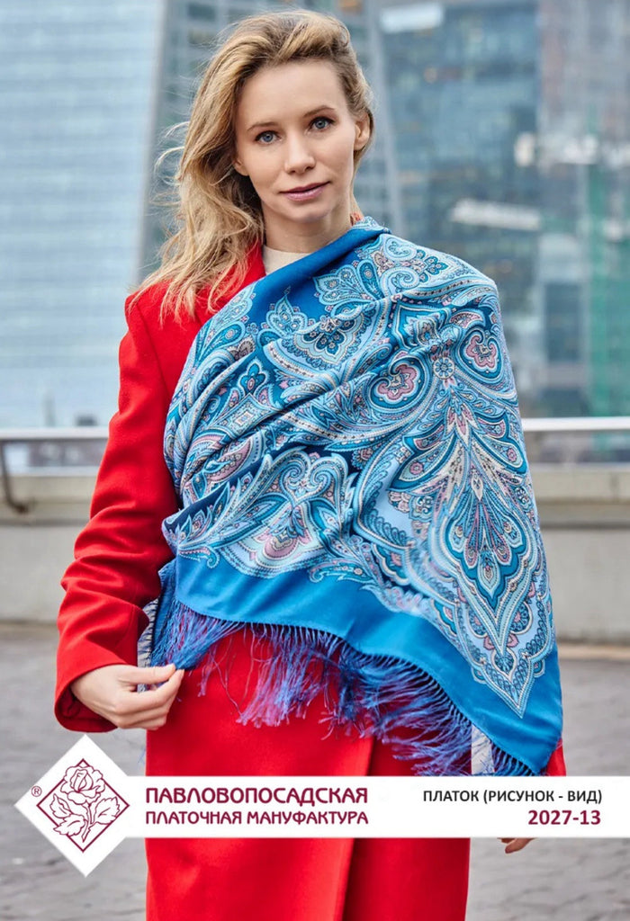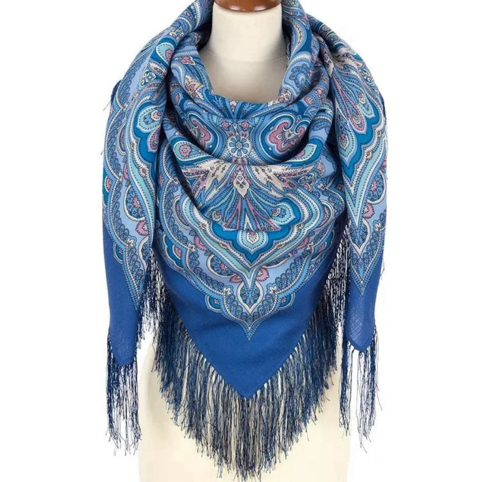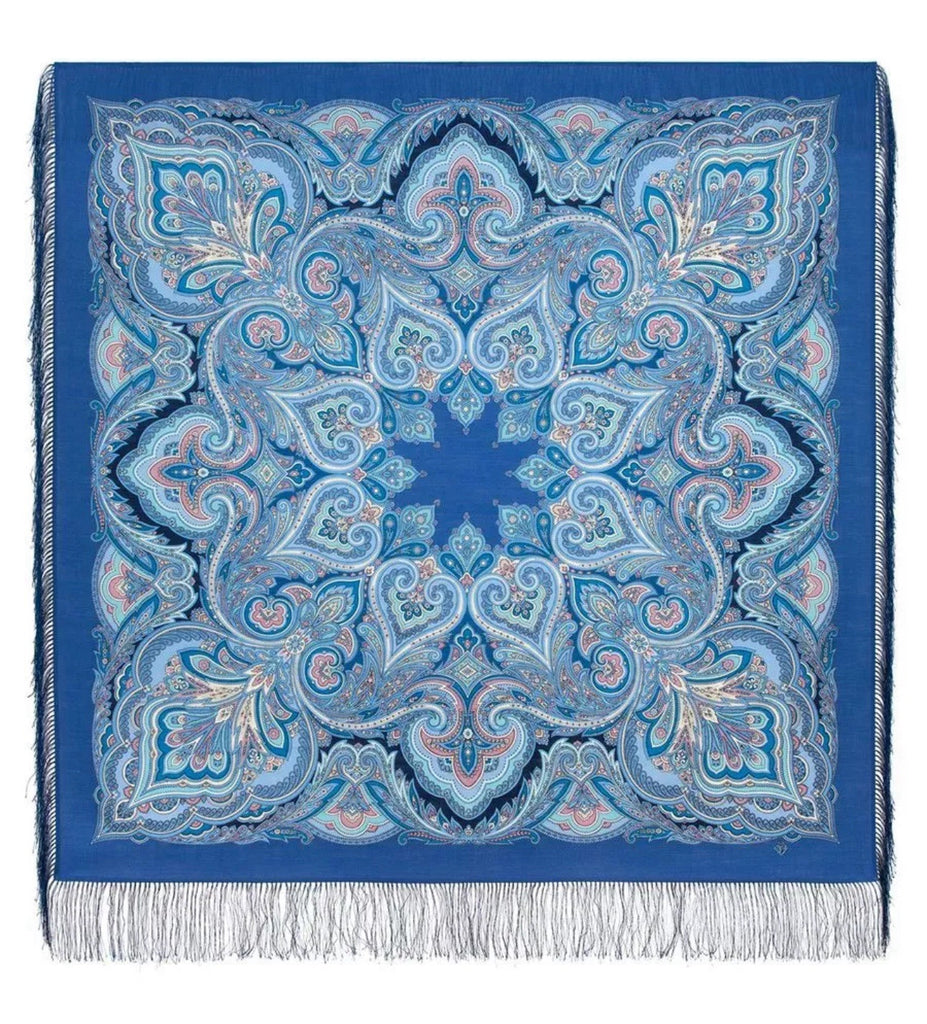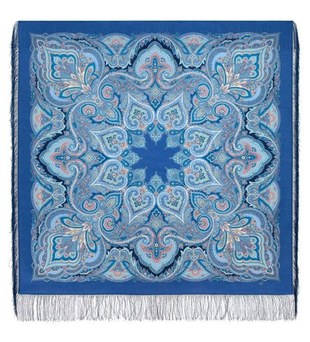 Wrap yourself in the timeless elegance of the Pavlovo Posad 2027-13 scarf, a versatile addition to any wardrobe. Crafted from natural Merino wool, this square-shaped scarf features a captivating light blue, navy blue, and beige floral pattern with accents of leaves and flowers that exude a natural charm. Designed to be a multifunctional piece, it can serve as a head scarf, neck warmer, shawl, or stole to complement various outfits and seasons.