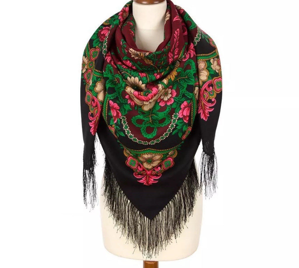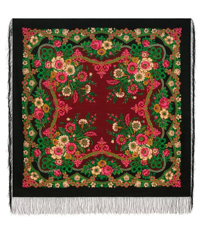 This Pavlovo Posad 573 square bright shawl is a luxurious and versatile accessory made from warm merino wool, featuring a beautiful floral Russian traditional pattern of leaves and flowers in shades of green, pink, and burgundy red. The shawl is adorned with fringe accents and can be worn as a headscarf, neck warmer, or stole, making it a practical and stylish addition to any wardrobe for all seasons. Handcrafted in the Russian Federation, this nature-inspired piece exudes a sense of nostalgia and charm.