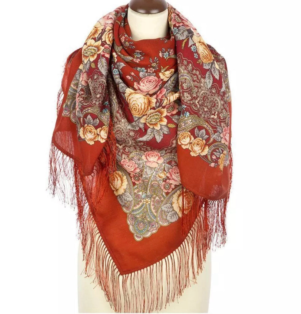 Wrap yourself in the timeless elegance of the Pavlovo Posad 49” large scarf, a versatile accessory that transcends seasons. Crafted from luxurious merino wool, this square-shaped shawl features a vibrant palette of red, orange, and pink, accented by a silky fringe that adds a touch of sophistication to any outfit.