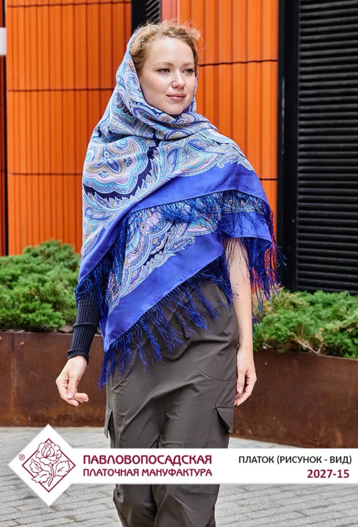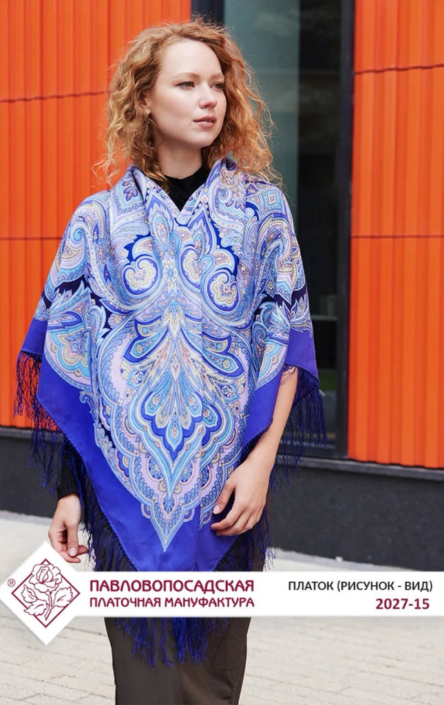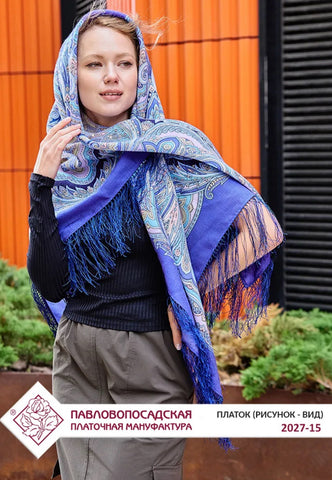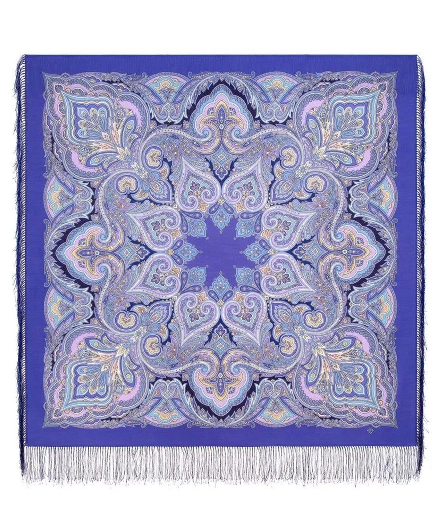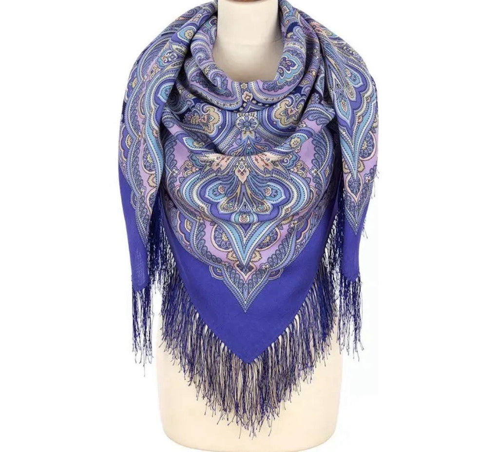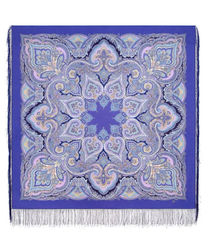 Wrap yourself in the elegance of the Pavlovo Posad scarf, a timeless piece that effortlessly complements any ensemble. Crafted from luxurious merino wool, this square-shaped scarf features a stunning floral pattern with intricate leaves and flowers that evoke the beauty of nature. Its vibrant purple, blue, and gray hues are versatile enough for a variety of occasions, while the sophisticated fringe accents add a touch of traditional charm.