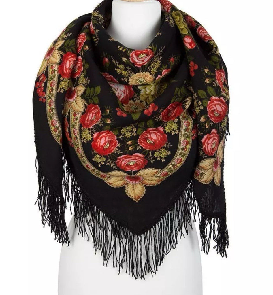 Discover a 35'' Russian square black scarf made of 100% Merino wool, featuring a floral pattern with leaves and flowers design in beige, and pinky red colors. This scarf is from the Pavlovo Posad brand and has wollen fringe accents, making it a versatile piece for various occasions such as a head scarf, shawl, neck warmer, or stole. With a nature theme and suitable for all seasons, this Russian shawl is a stylish and functional addition to any woman's wardrobe.