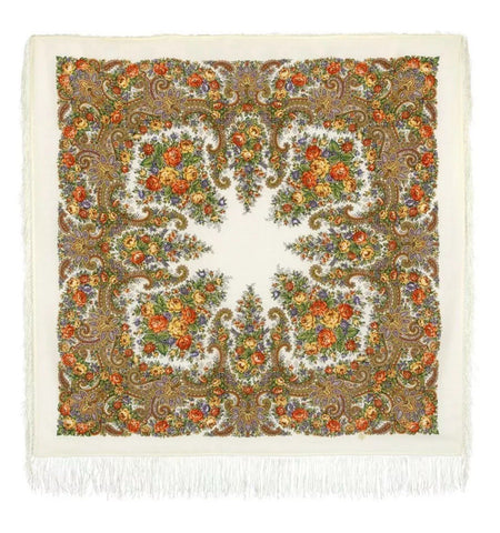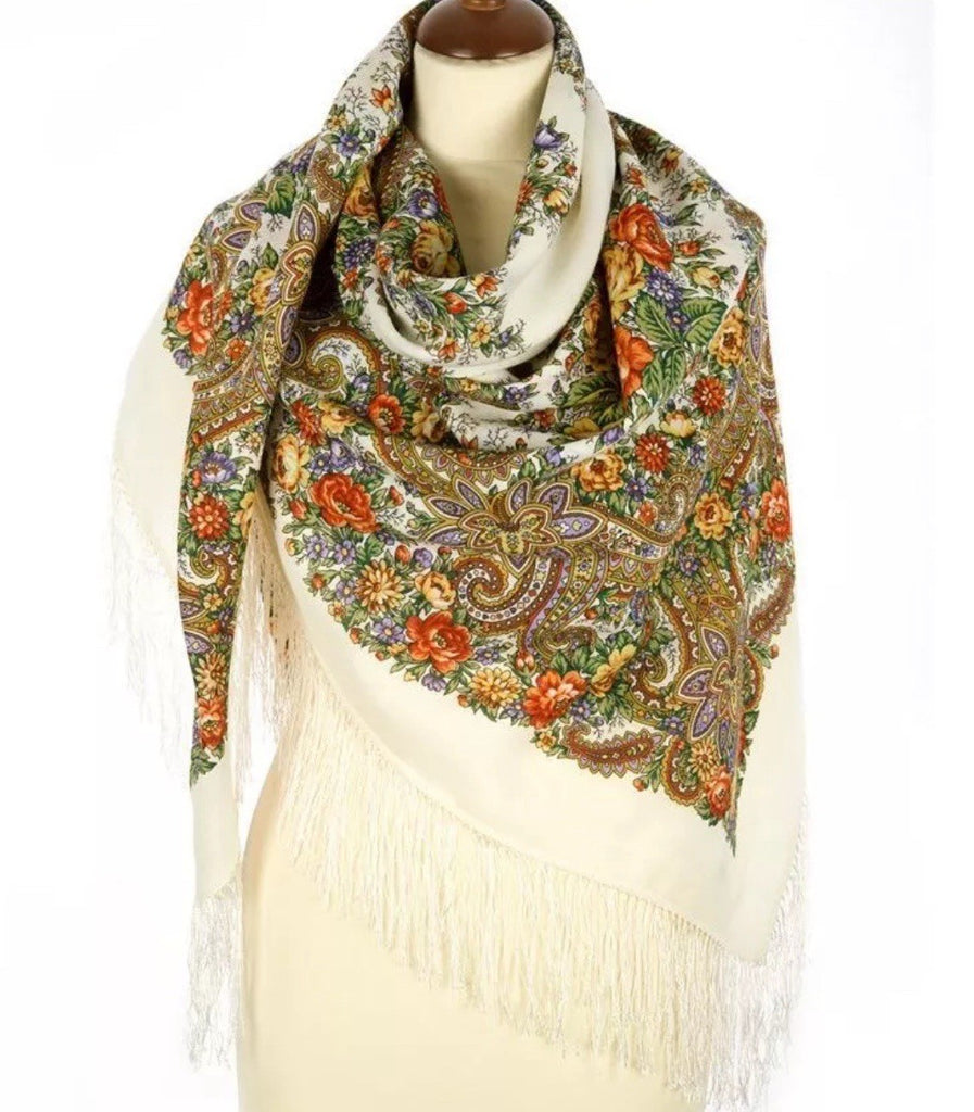 This 35'' Russian square scarf by Pavlovo Posad is made of 100% Merino wool in shades of green, with a floral pattern featuring leaves and flowers. The creamy white scarf is designed with fringe accents and can be worn as a headscarf, shawl, neck warmer, or stole, making it a versatile and stylish accessory for all seasons. With its nature-inspired theme and high-quality material, this cozy wrapping scarf is a beautiful and unique addition to any wardrobe, perfect for adding a touch of elegance to any outfit. These Russian