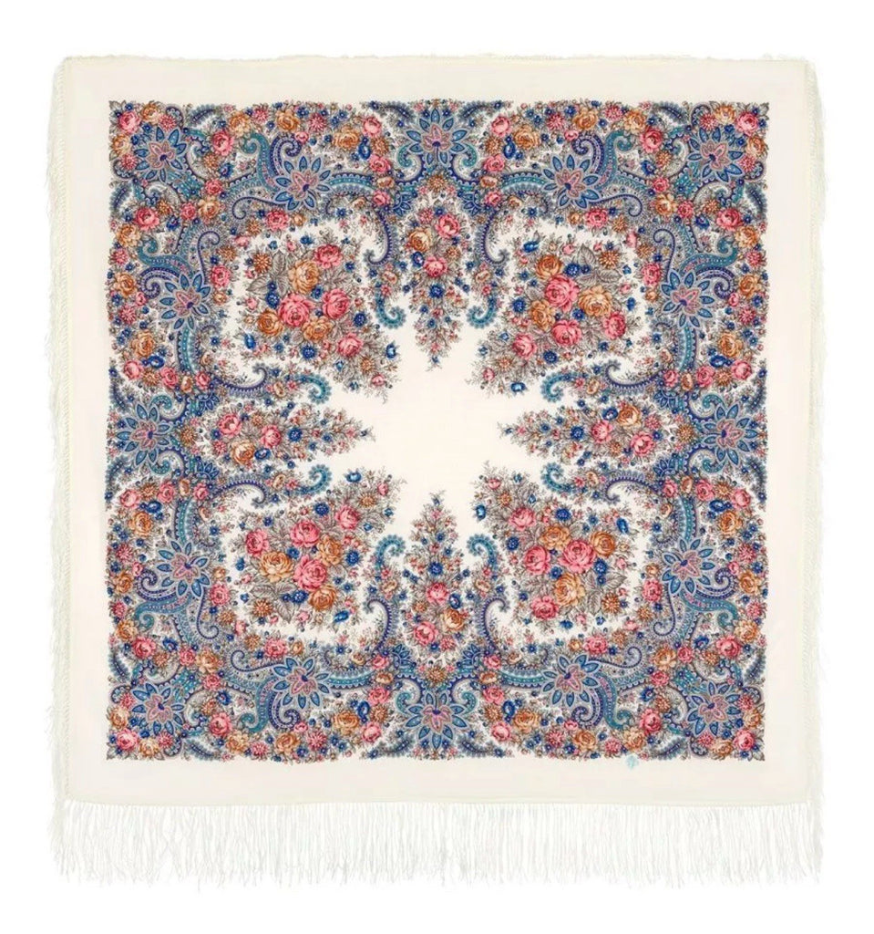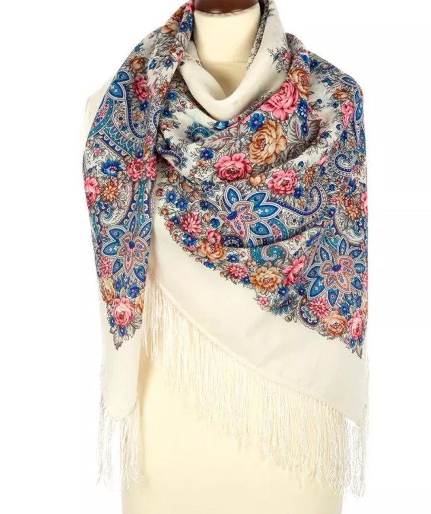 Discover a 35'' Russian milky white square scarf made from high-quality Merino wool in a floral pattern with large leaves and flowers design. The wrapping shawl features intricate colors such as blue, turquoise, orange, and pink, adding a touch of nature theme to any outfit. It comes with silky fringe accents and can be styled as a headscarf, shawl, neck warmer, or stole, making it a versatile and practical accessory for any season. The cozy scarf is designed by Pavlovo Posad, a well-known brand known for its traditional and authentic Russian designs. Experience the