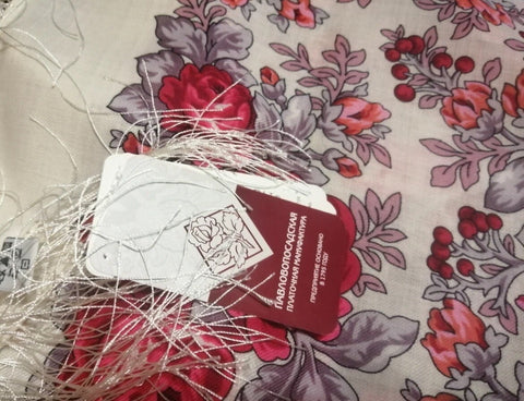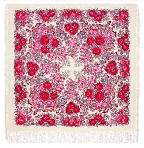 This Pavlovo Posad square shawl is made from soft 100% merino wool in a white and pink floral pattern, inspired by Slavic traditional outfit. Measuring 49x49 inches (125x125 cm), it features silky fringe accents for added detail. This versatile Russian scarf can be worn as a shawl or wrap, perfect for adding a retro touch to your outfit in any season.