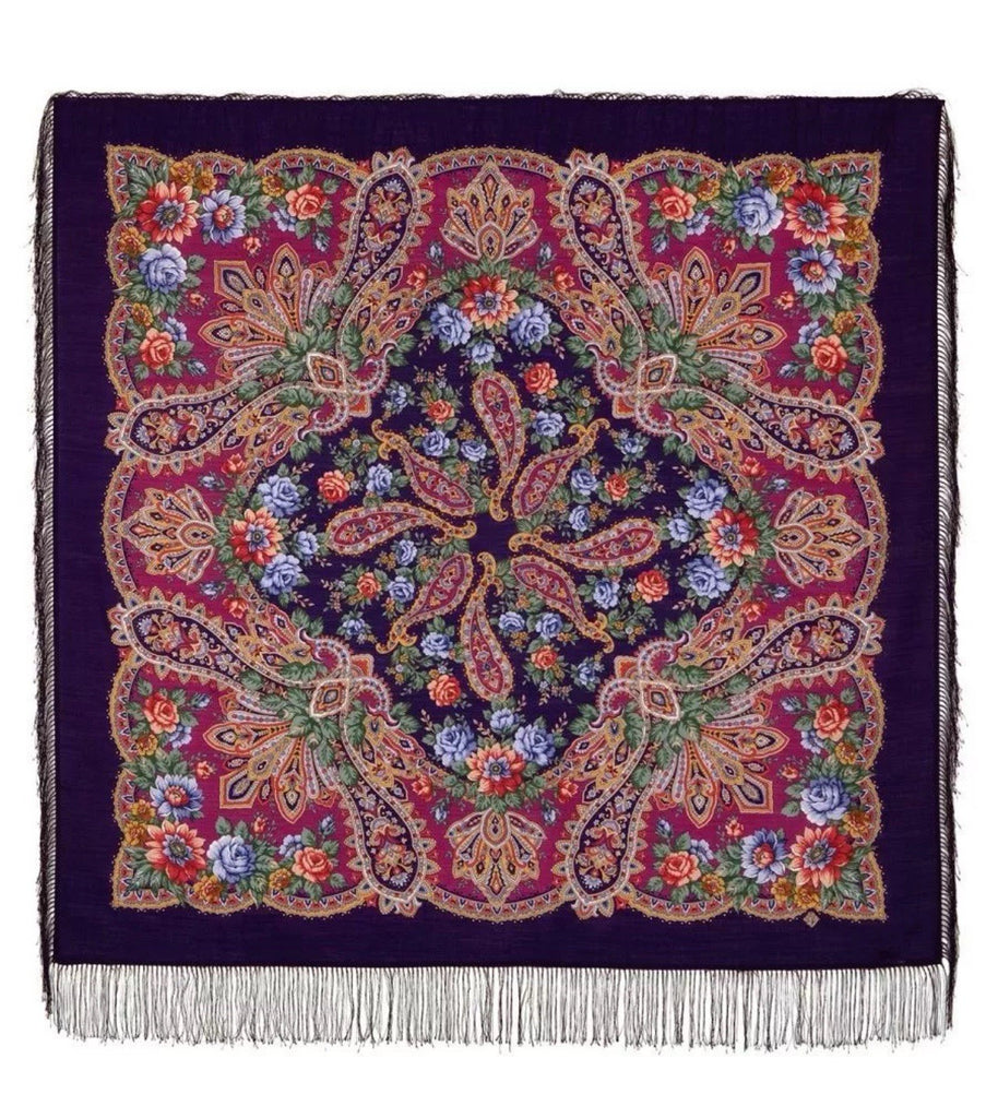 This 49'' deep purple square scarf is made of 100% merino wool from Russia, featuring a floral pattern inspired by vintage designs with peony and roses. The versatile scarf can be used as a head accessory, shawl, neck warmer, or stole, making it a practical and stylish addition to any wardrobe. The rich colors of dark purple, orange, pink, and green add a pop of nature-themed beauty to the scarf, perfect for all seasons. Dry cleaning only to maintain its quality. Made by the brand Pavlovo Posad in Russian Federation.