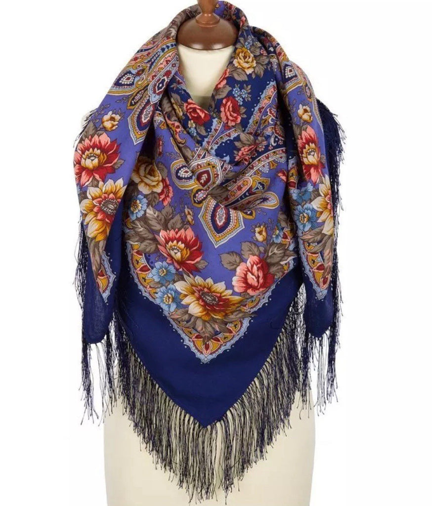 This 49'' square scarf is made from 100% merino wool, featuring a vintage-inspired floral pattern with peony and roses. The cozy and soft scarf includes a beautiful navy blue, light blue, orange, and purple color palette, perfect for all seasons. Made by the brand Pavlovo Posad in the Russian Federation, this multifunctional accessory can be used as a head scarf, wrapping shawl, neck warmer, or stole, making it a versatile and stylish addition to any wardrobe.