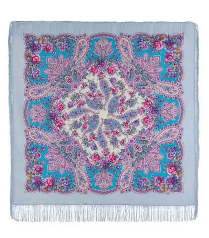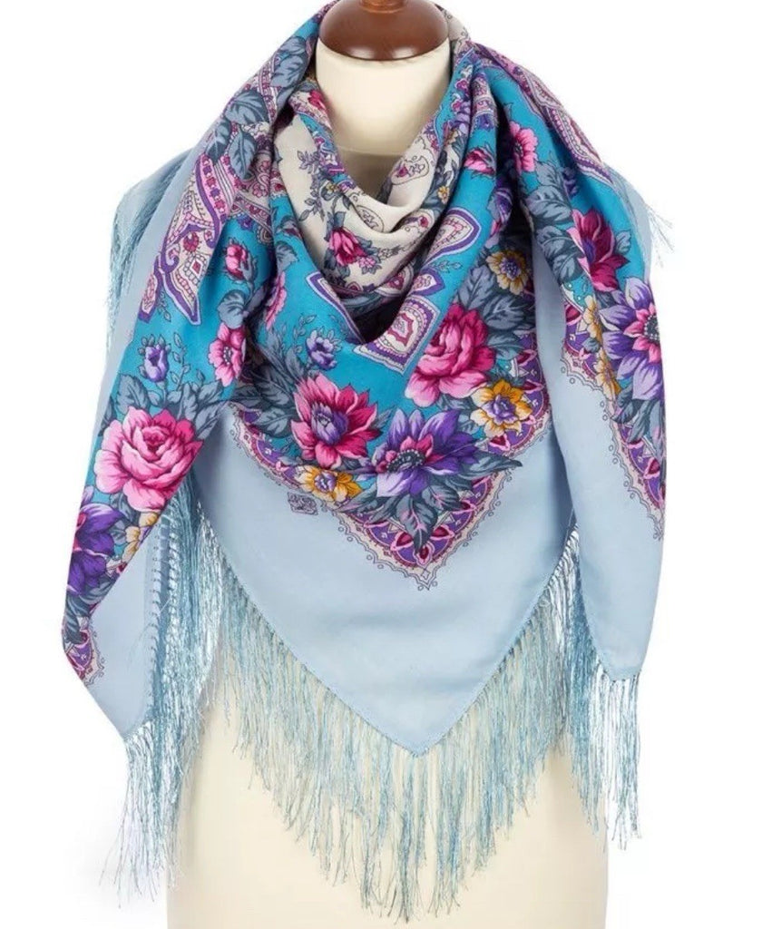 This 49'' square scarf is made of 100% merino wool and features a vintage inspired floral pattern with peony and roses. This soft and cozy scarf is in shades of sky blue, raspberry pink, purple, orange, and gray, making it a versatile accessory for all seasons. Designed by Pavlovo Posad in the Russian Federation, this multifunctional shawl can be used as a headscarf, neck warmer, or stole, providing warmth and style to any outfit. Dry clean only to maintain its quality, this cozy scarf is a unique and beautiful addition to any wardrobe.