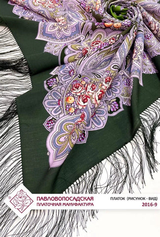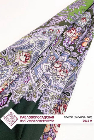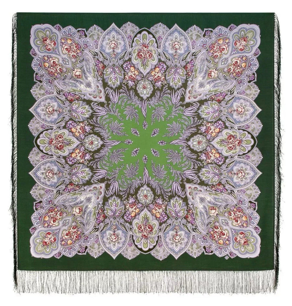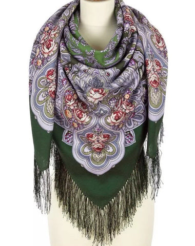 This product is a 49" square scarf made of natural merino wool in a mix of dark green and salad green colors, featuring a floral pattern with leaves and flowers. The woolen scarf is from the Pavlovo Posad brand and is designed with a nature theme, making it a versatile accessory that can be used as a headscarf, shawl, neck warmer, or stole during any season of the year. Made in the Russian Federation, this scarf is perfect for women looking to add a touch of nature-inspired style to their outfit.