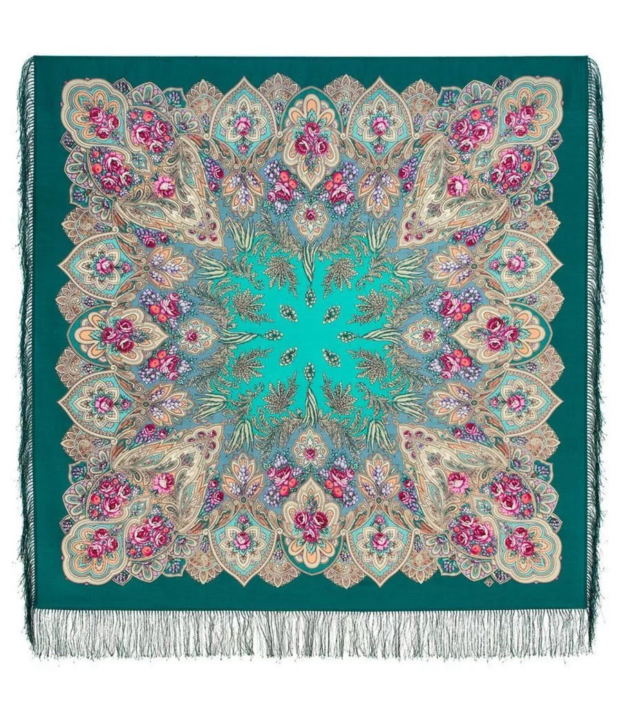 This 49” scarf square in natural merino wool is a beautiful pink shawl with a floral pattern, perfect for adding a touch of nature to your wardrobe. The versatile shawl can be worn as a headscarf, neck warmer, or stole, making it a functional and stylish accessory for all seasons. Made in the Russian Federation by the brand Pavlovo Posad, this shawl features a mix of turquoise, beige, and pink colors, with intricate leaves and flowers adding a charming touch to your look.