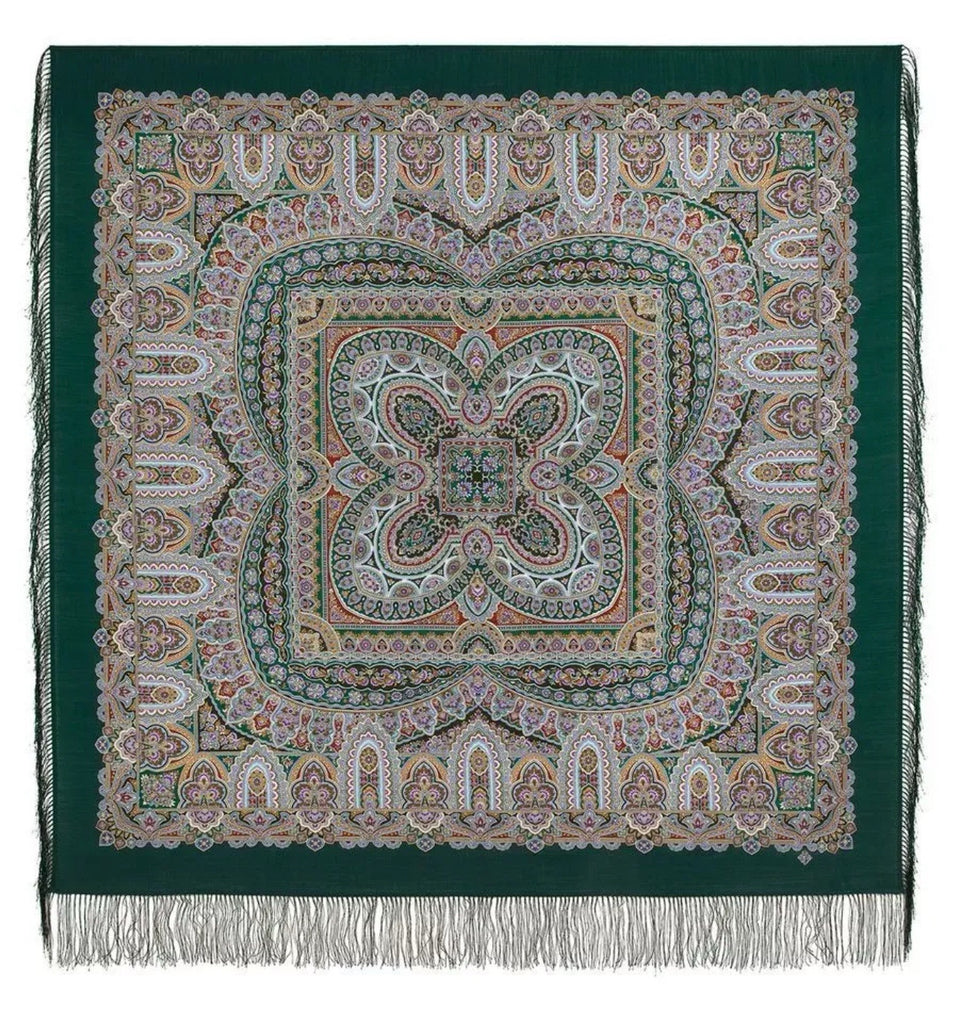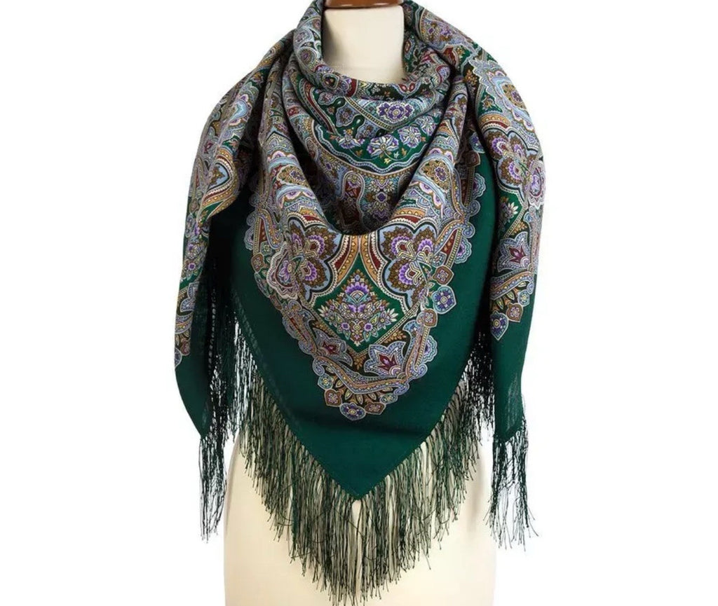 This Pavlovo Posad scarf is a 49" square made of green Merino wool, featuring a design of flowers and leaves in orange and turquoise. The scarf is adorned with fringe accents and is meant to be dry cleaned only. It can be styled as a head scarf, shawl, neck warmer, or stole, making it a versatile accessory for all seasons. This Slavic-themed scarf is a perfect Russian gift and adds a touch of elegance to any outfit.