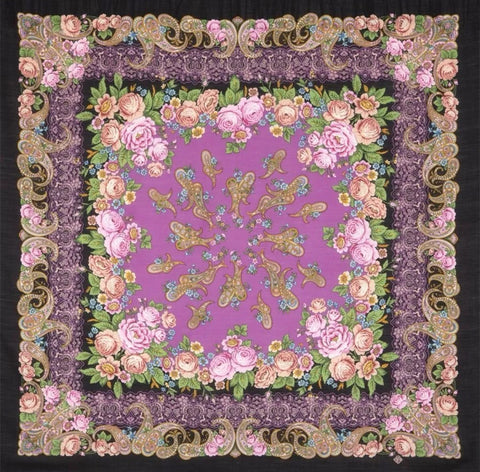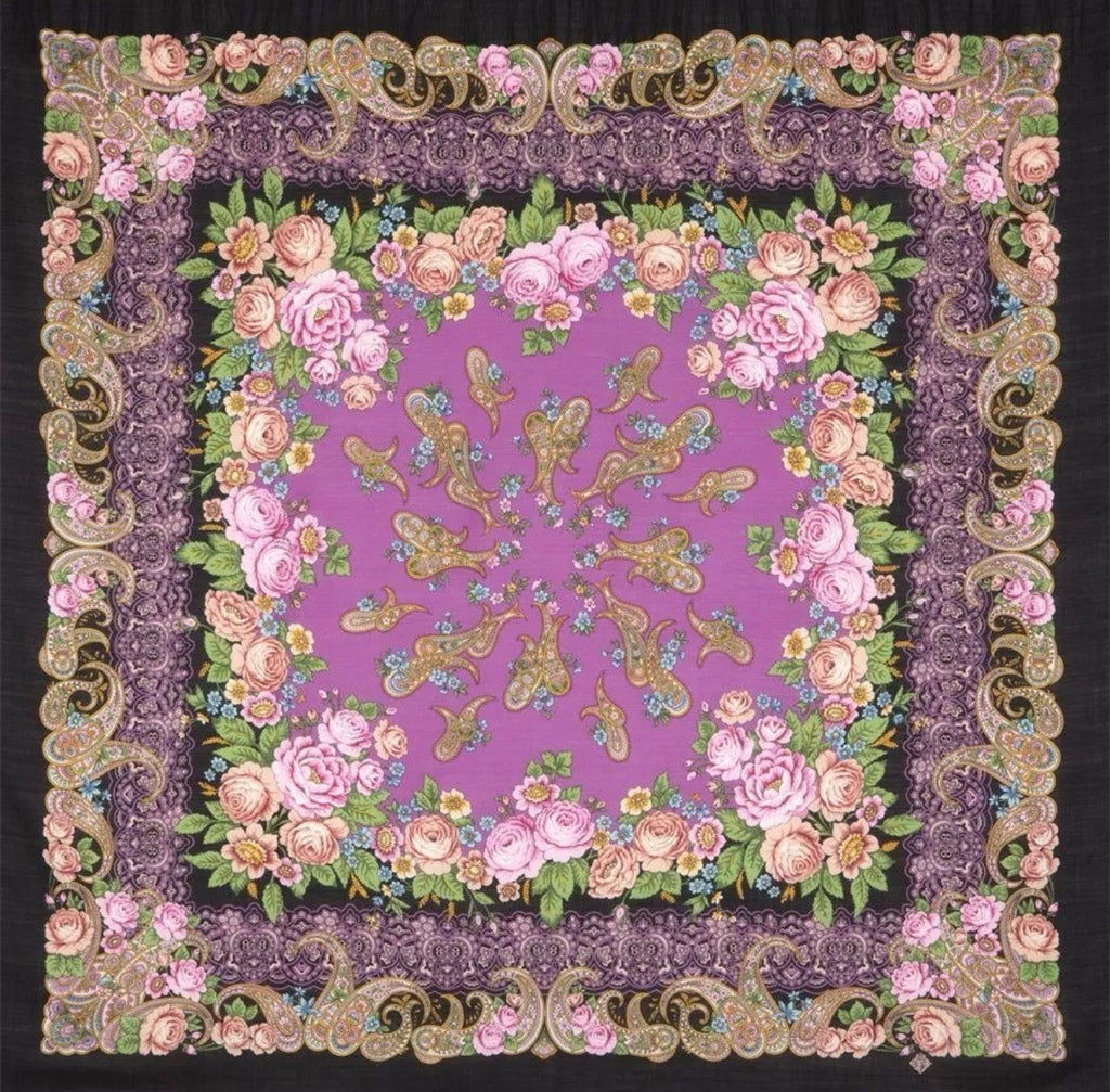 The scarf presents a striking palette of black, purple, raspberry pink, green, and beige, accented by a silky fringe that adds a touch of luxury. Designed to be a multifunctional piece, it serves as a head scarf, neck warmer, shawl, or stole, making it an essential addition to any wardrobe. Carefully manufactured in the Russian Federation, this scarf is a testament to quality craftsmanship and timeless style. Pavlovo Posad well-known Russian brand has been producing high-quality shawls and scarves since the middle of 19th century.