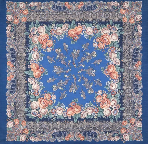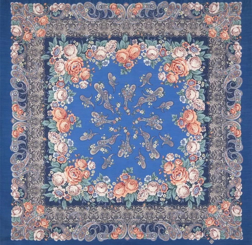 Adorned with a vibrant floral pattern featuring an array of hues including blue, peach, beige, white, and light blue, this square-shaped scarf is designed with a boho-ethnic theme in mind, ensuring a unique touch to your ensemble. The scarf's silky fringe adds a sophisticated finish, making it a standout piece that complements any outfit. Pavlovo Posad well-known Russian brand has been producing high-quality shawls and scarves since the middle of 19th century.