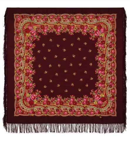 Upgrade your winter style with our scarves and stoles from Pavlovo Posad, the famous Russian brand since the 19th century. Made with 100% merino wool, the burgundy wine red base features delicate red and pink flowers and a fringe for a touch of elegance. Stay warm and fashionable this season. With a dry clean only care instruction, this scarf is versatile and can be worn as a neck warmer in winter or as a stylish addition to your outfit in the summer, fall, and spring seasons. Perfect for adding a touch of Slavic elegance to any look.