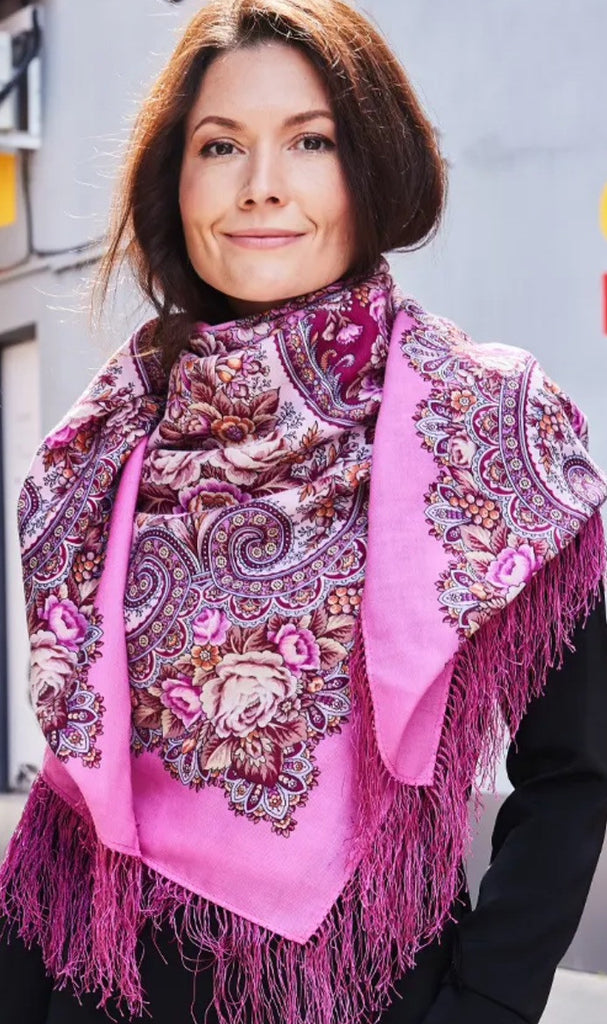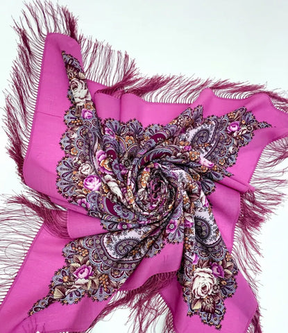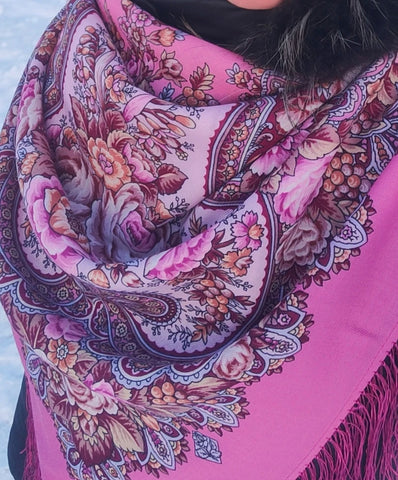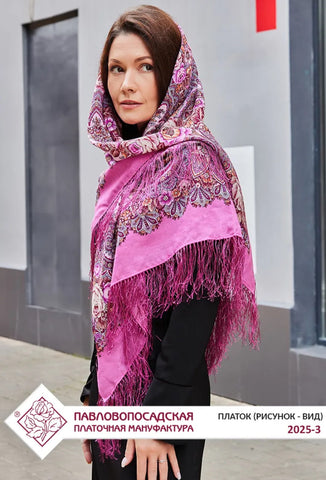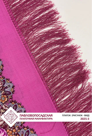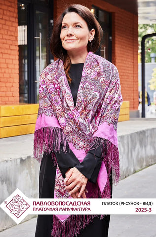 This Pavlovo Posad scarf is a square piece made of soft merino wool in shades of pink, beige, and gray, featuring a delicate floral pattern of leaves and flowers. The scarf can be styled in various ways such as a head scarf, shawl, neck warmer, or stole, making it versatile for different occasions. With accents of fringe, this scarf titled "Vinnie Yagodi 2025-3" embodies a nature-themed design perfect for adding a touch of elegance to your outfit during winter, summer, fall, or spring. Made in the Russian Federation, this scarf is a chic accessory for women. Upgrade your winter style with our Scarves and Stoles from Pavlovo Posad, the famous Russian brand since the 19th century. With a dry clean only care instruction, this scarf is versatile and can be worn as a neck warmer in winter or as a stylish addition to your outfit in the summer, fall, and spring seasons. Perfect for adding a touch of modern elegance to any look.