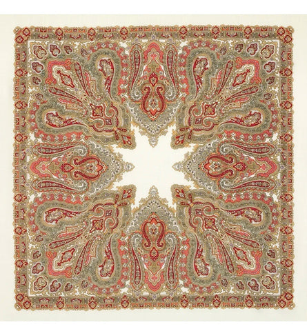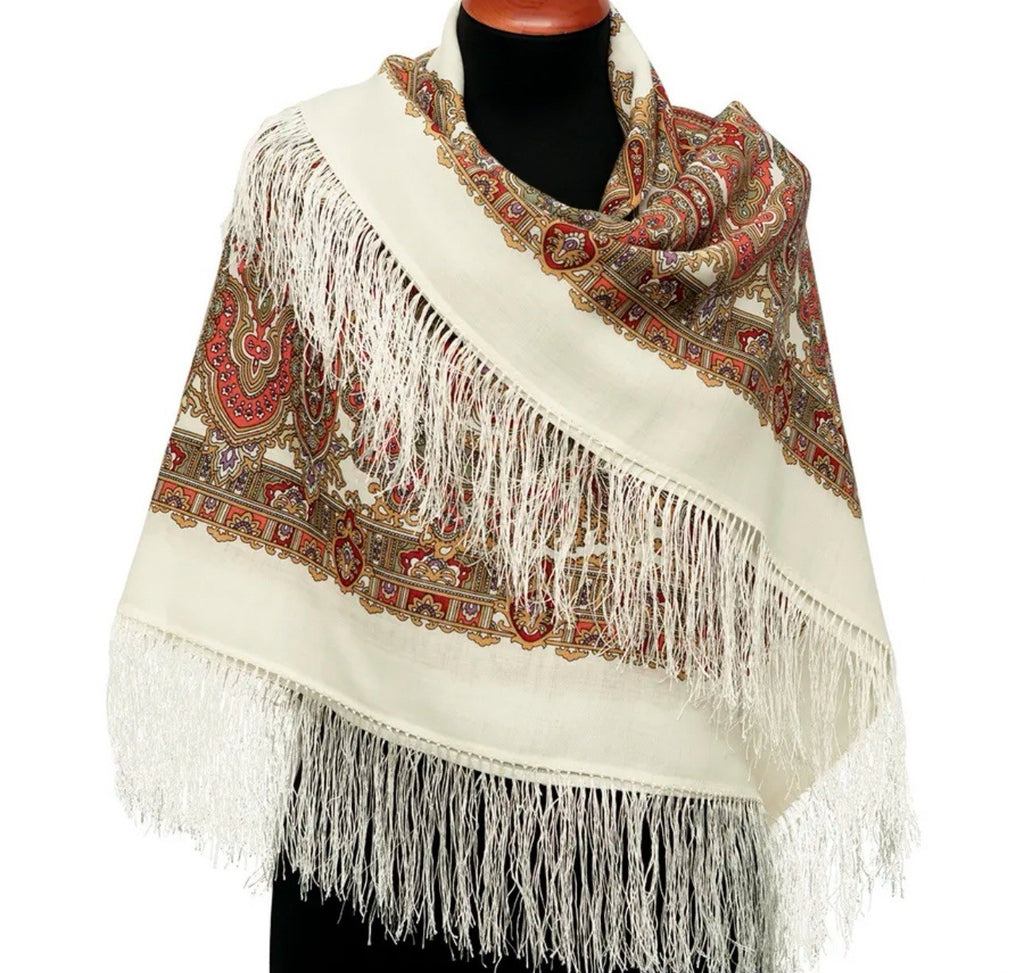 Wrap yourself in the cozy embrace of this Pavlovo Posad merino wool scarf, a versatile accessory that transcends seasons. With its vibrant mix of ivory beige, red and yellow hues, this square scarf is adorned with a delicate herbal pattern featuring leaves and flowers that bring a touch of nature to any ensemble. The scarf's fringed accents add a rustic charm, making it an elegant statement piece.