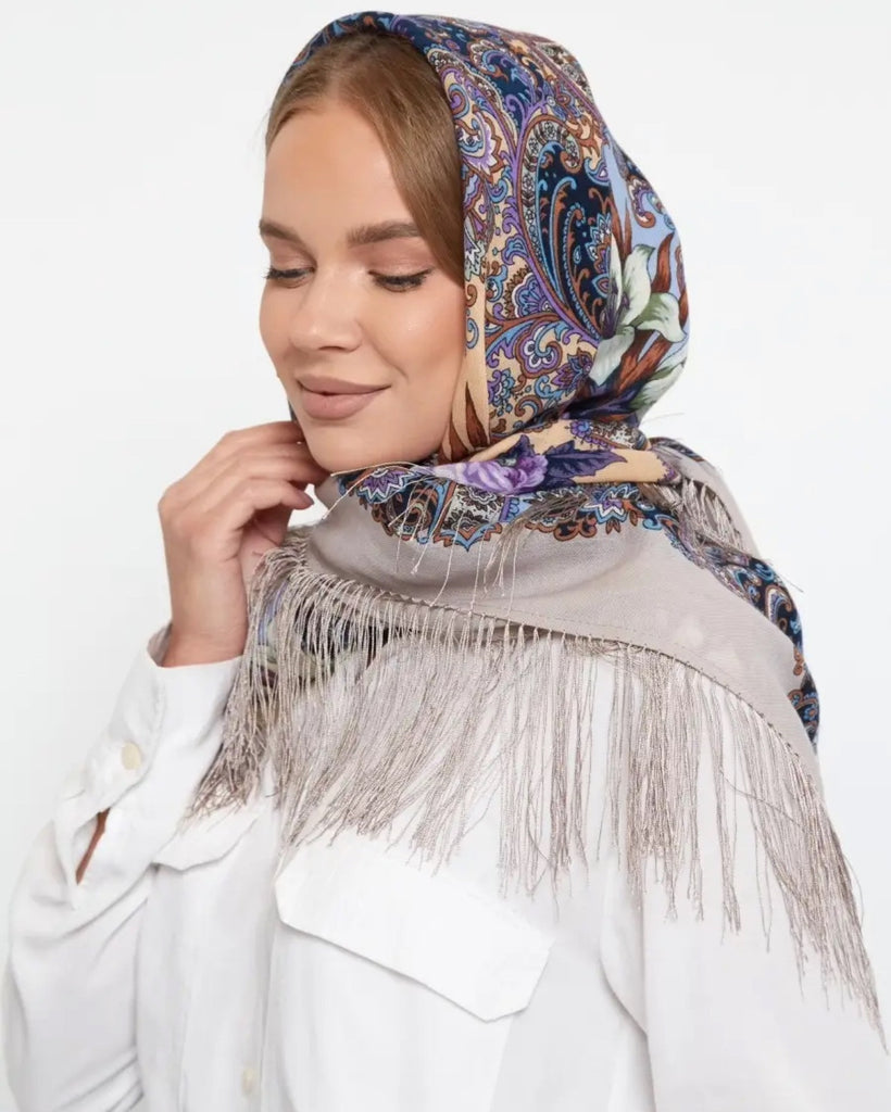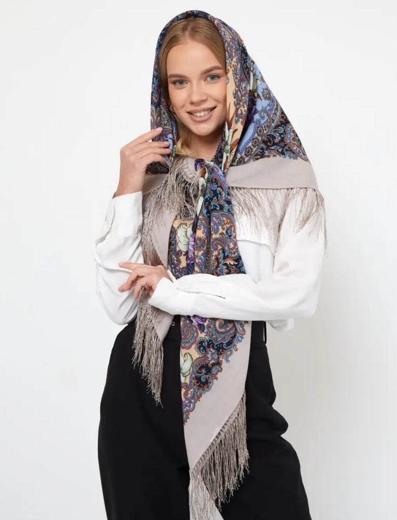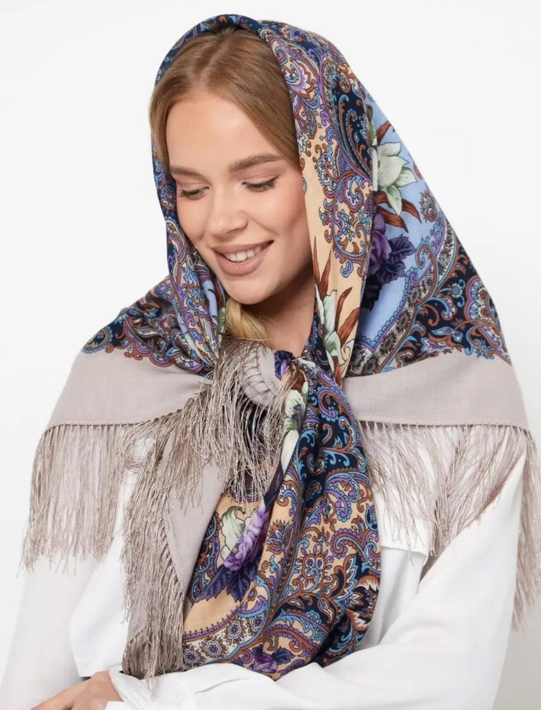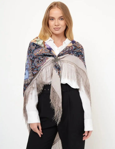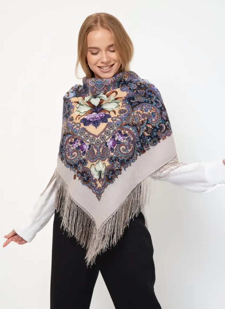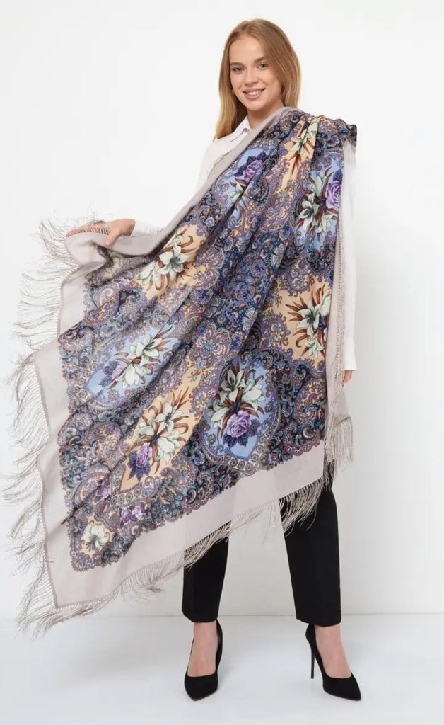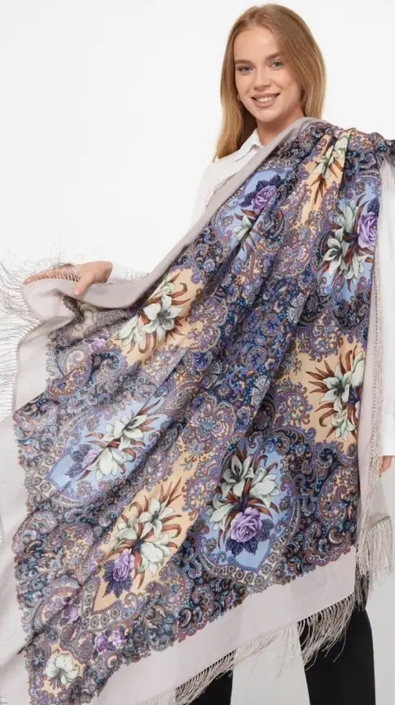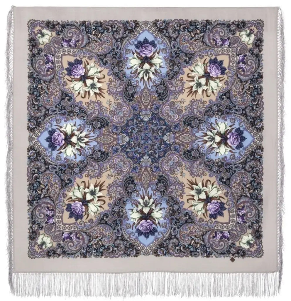 This 49" square merino wool scarf by Pavlovo Posad features a floral pattern in light blue, orange, silver, and purple colors, with silky fringe accents. The scarf, titled "Skazki letney nochi," showcases leaves and flowers, giving it a nature theme. It can be styled as a head scarf, shawl, neck warmer, or stole, and is suitable for winter, summer, fall, and spring seasons. This versatile accessory is designed for women who appreciate high-quality materials and intricate design details.With a dry clean only care instruction, this scarf is versatile and can be worn as a neck warmer in winter or as a stylish addition to your outfit in the summer, fall, and spring seasons. Perfect for adding a touch of modern elegance to any look.