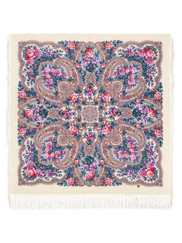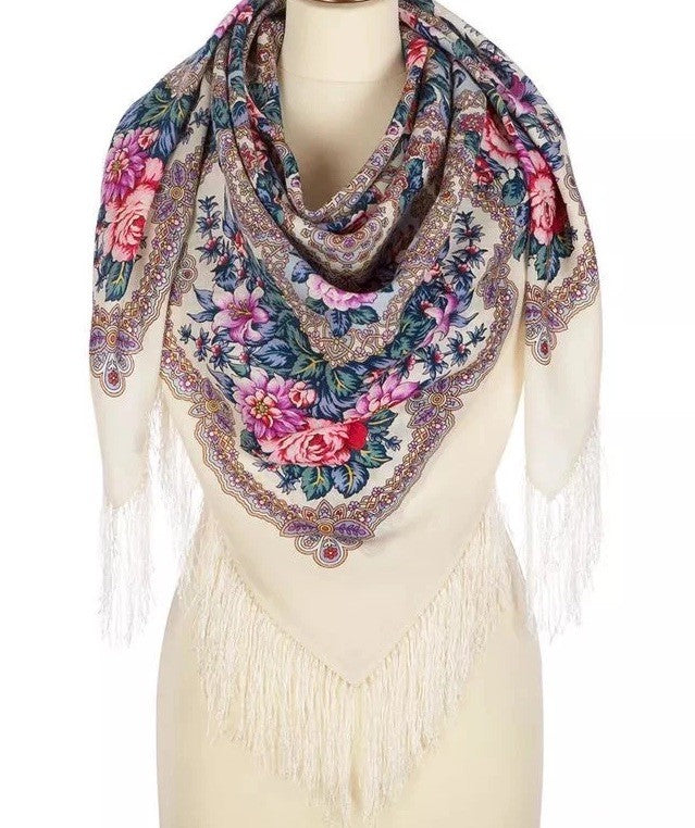 Upgrade your winter style with our Scarves and Stoles from Pavlovo Posad, the famous Russian brand since the 19th century. Experience luxurious warmth and style with our 100% merino wool big square scarf. The interesting design boasts large roses in shades of pink and purple, adding a pop of color to any outfit. The overall scarf is delicate milky white, making it a versatile addition to your wardrobe. With a dry clean only care instruction, this scarf is versatile and can be worn as a neck warmer in winter or as a stylish addition to your outfit in the summer, fall, and spring seasons. Perfect for adding a touch of Slavic elegance to any look.