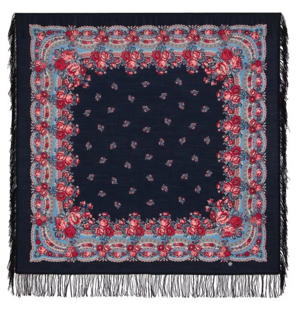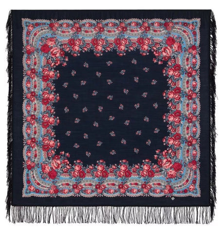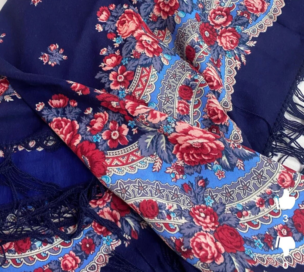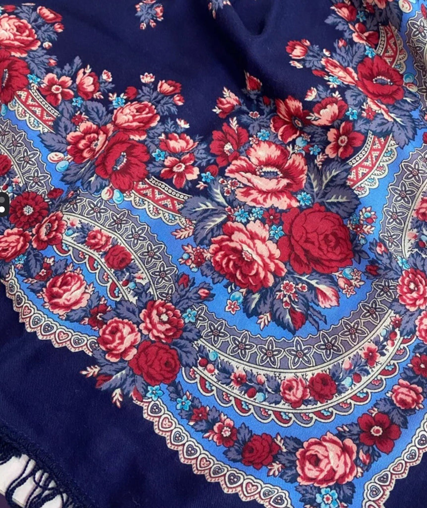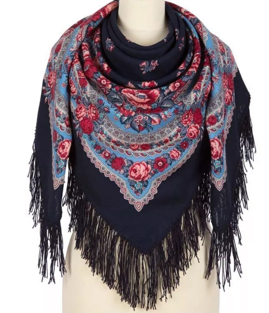 This scarf is a 49'' square made of 100% natural merino wool in a beautiful blue, red and pink floral pattern by the Russian brand Pavlovo Posad. It features leaves and flowers, making it a stylish accessory for women. With a dry clean only care instruction, this scarf is versatile and can be worn as a neck warmer in winter or as a stylish addition to your outfit in the summer, fall, and spring seasons. Perfect for adding a touch of Slavic elegance to any look.