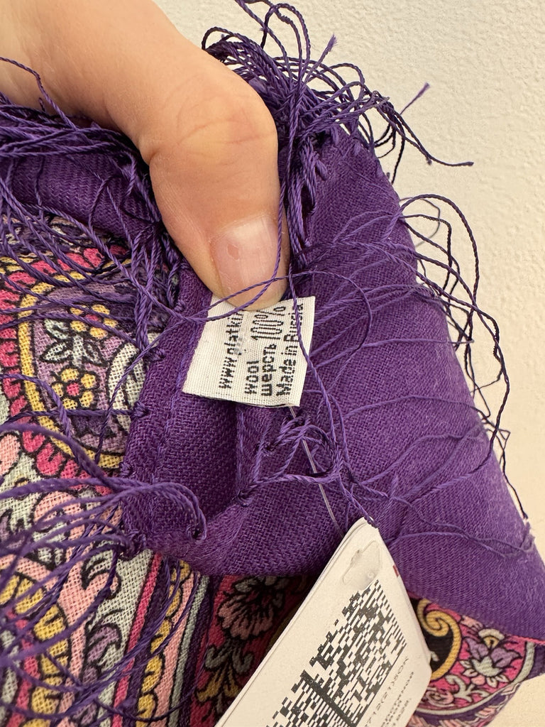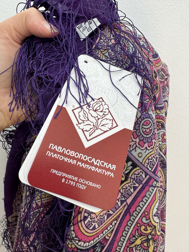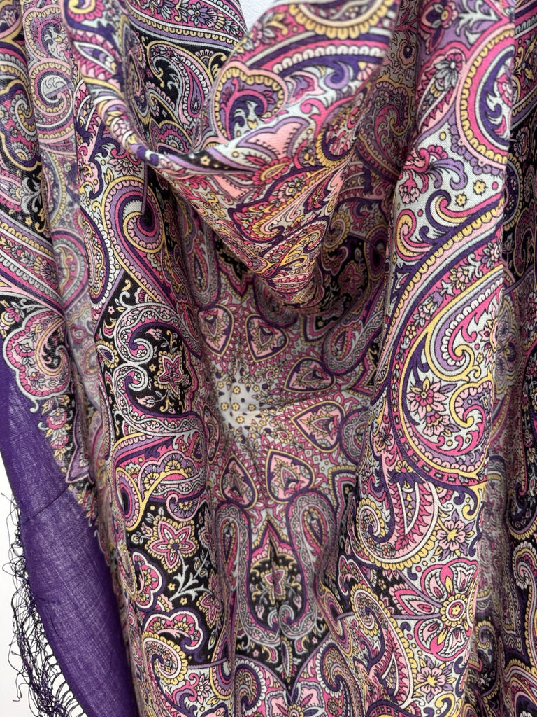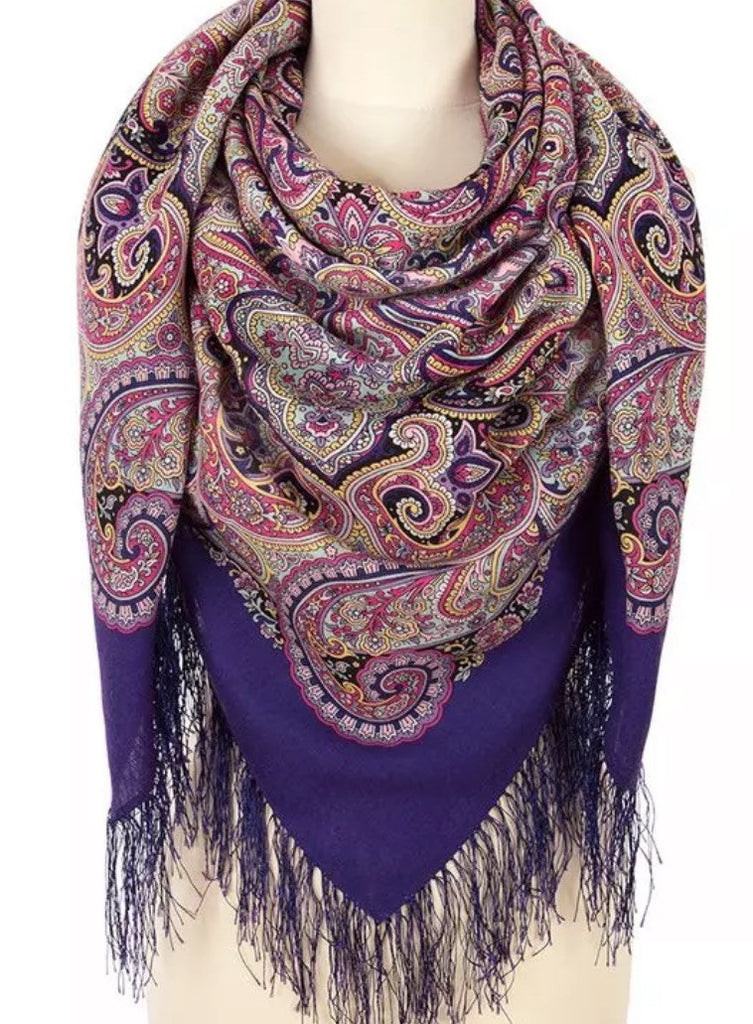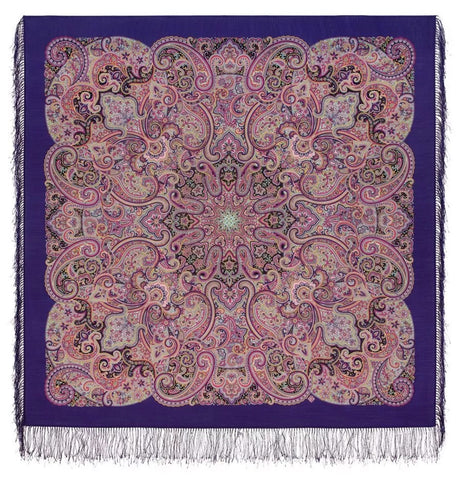 This 49" square scarf from Pavlovo Posad features a floral pattern in shades of purple and pink, crafted from high-quality authentic merino wool. The scarf is versatile, serving as a head scarf, shawl, neck warmer, hijab, or stole, making it perfect for various occasions. With accents of fringe and a design inspired by nature, specifically leaves and flowers, this scarf is a stylish accessory for all seasons, whether it's winter, summer, fall, or spring. Made in the Russian Federation, it adds a touch of elegance to any outfit. Made in the Russian Federation, this versatile accessory is perfect for adding a touch of nature to your outfit in any season. Upgrade your winter style with our Scarves and Stoles from Pavlovo Posad, the famous Russian brand since the 19th century. With a dry clean only care instruction, this scarf is versatile and can be worn as a neck warmer in winter or as a stylish addition to your outfit in the summer, fall, and spring seasons. Perfect for adding a touch of modern elegance to any look.