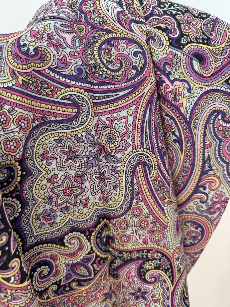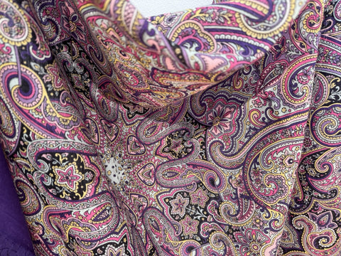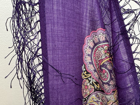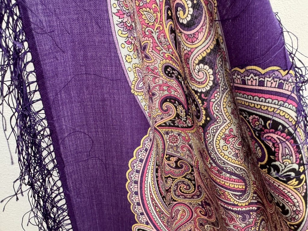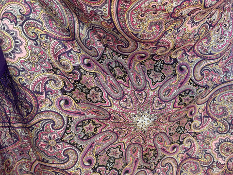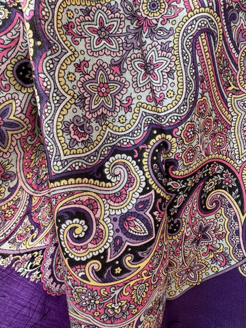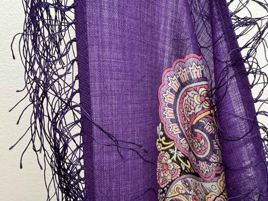 This 49" square scarf from Pavlovo Posad features a floral pattern in shades of purple and pink, crafted from high-quality authentic merino wool. The scarf is versatile, serving as a head scarf, shawl, neck warmer, hijab, or stole, making it perfect for various occasions. With accents of fringe and a design inspired by nature, specifically leaves and flowers, this scarf is a stylish accessory for all seasons, whether it's winter, summer, fall, or spring. Made in the Russian Federation, it adds a touch of elegance to any outfit. Made in the Russian Federation, this versatile accessory is perfect for adding a touch of nature to your outfit in any season. Upgrade your winter style with our Scarves and Stoles from Pavlovo Posad, the famous Russian brand since the 19th century. With a dry clean only care instruction, this scarf is versatile and can be worn as a neck warmer in winter or as a stylish addition to your outfit in the summer, fall, and spring seasons. Perfect for adding a touch of modern elegance to any look.