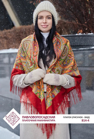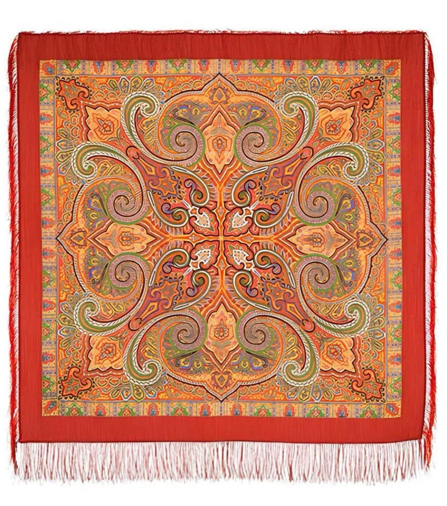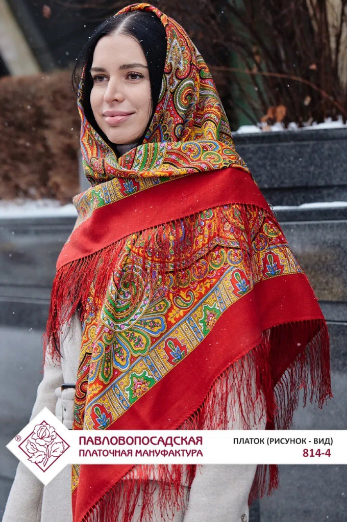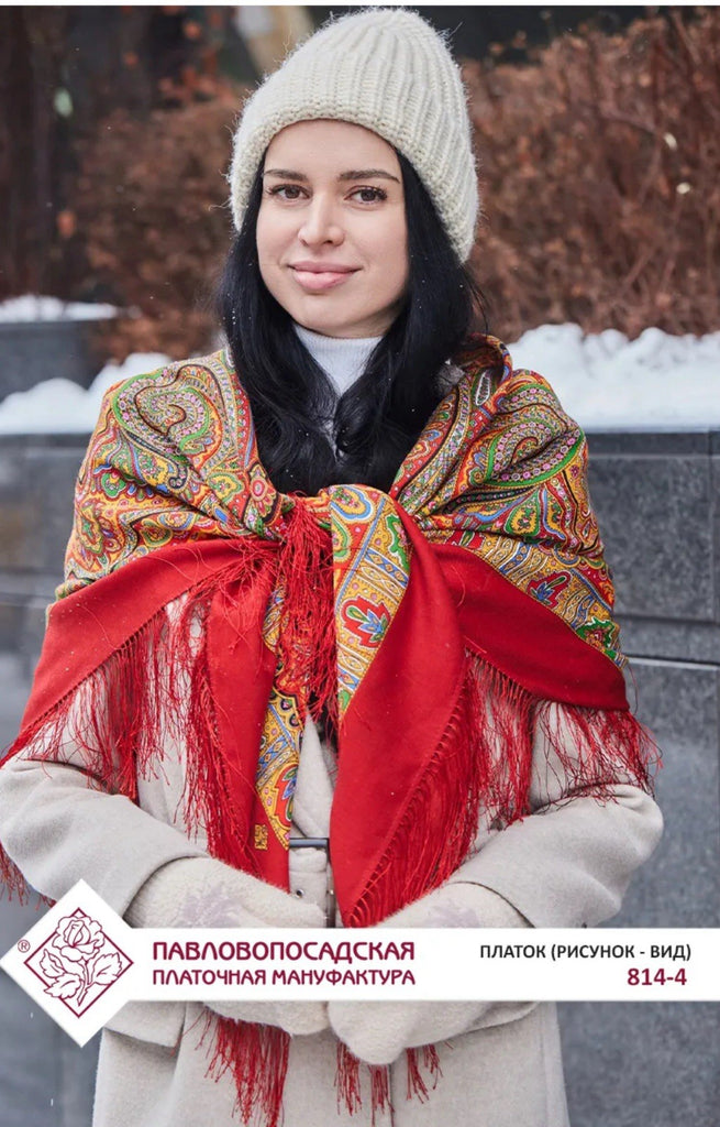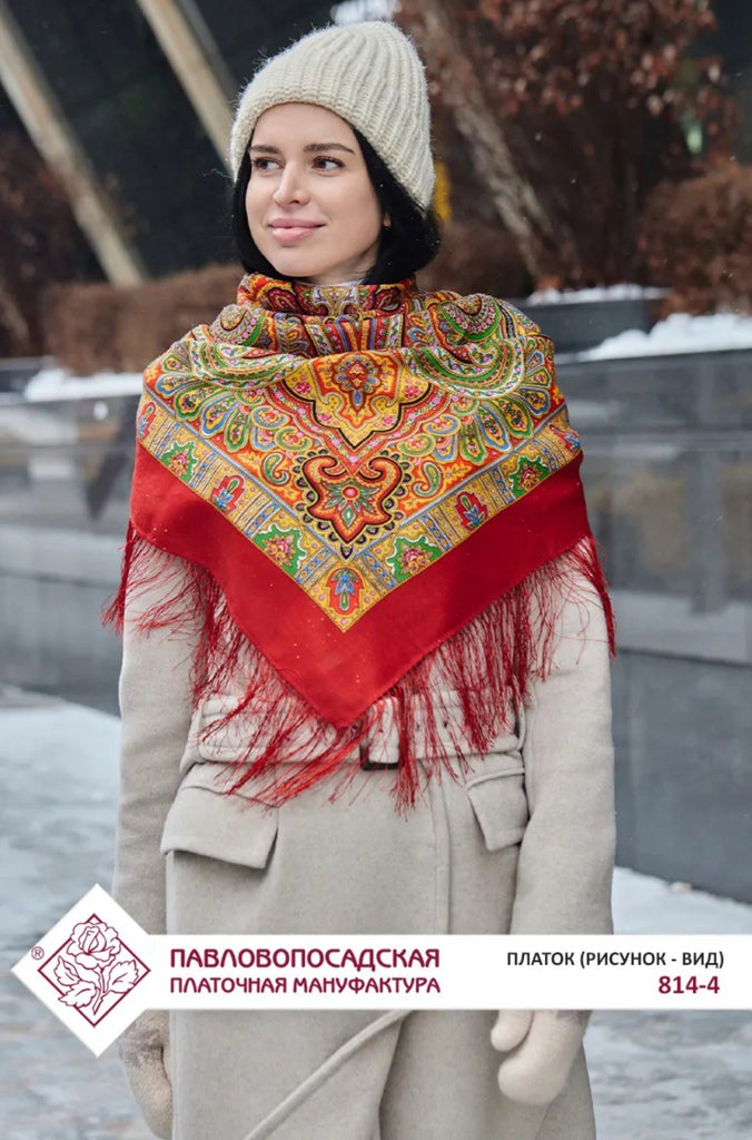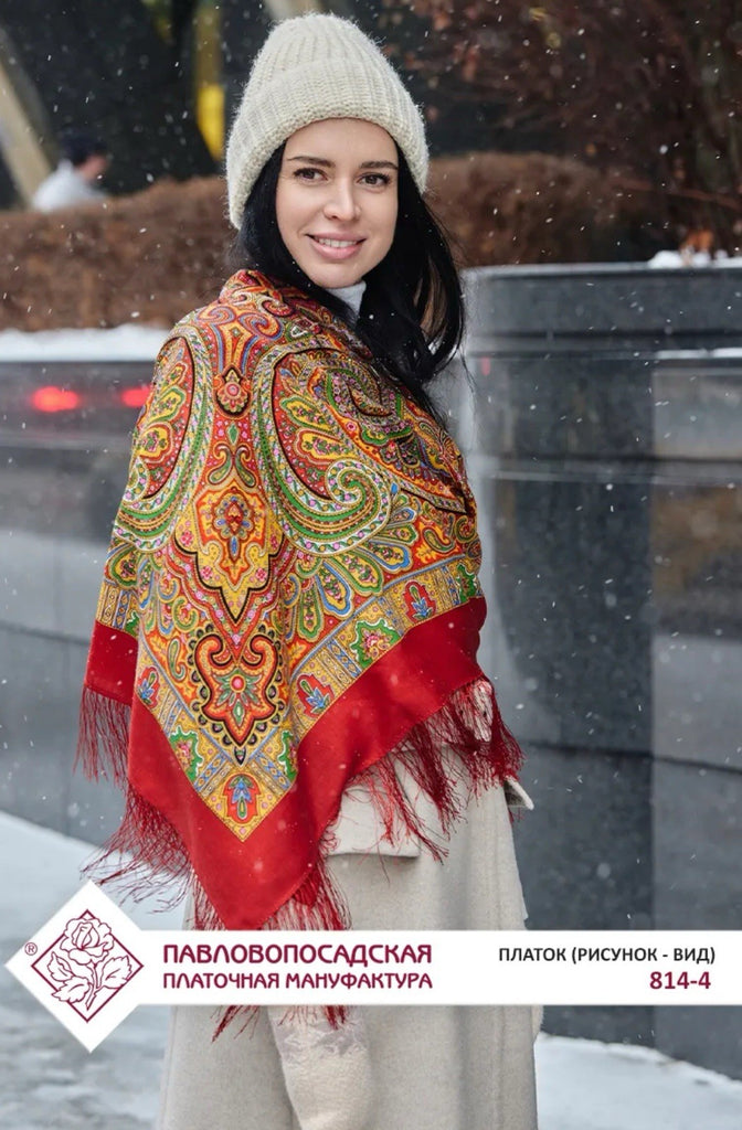 The product is a 49" square merino wool scarf with a Red, orange, green, and yellow color mix featuring a floral pattern. It has fringe accents and is designed for versatility, serving as a head scarf, shawl, neck warmer, and stole. Made in the Russian Federation by the brand Pavlovo Posad, this wollen red scarf is perfect for all seasons and adds a touch of nature-themed style to any outfit. The high-quality material and unique design make it a classic addition to any woman's wardrobe. At our store, you’ll discover a lovely selection of merino wool scarves in a variety of designs, colors, and sizes — each one crafted to offer warmth, elegance, and timeless style. Perfect for those who appreciate Slavic culture, or as a thoughtful gift for anyone who performs traditional Russian folk dances. It makes a beautiful and fitting accessory for folk dance attire.