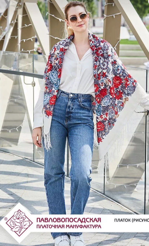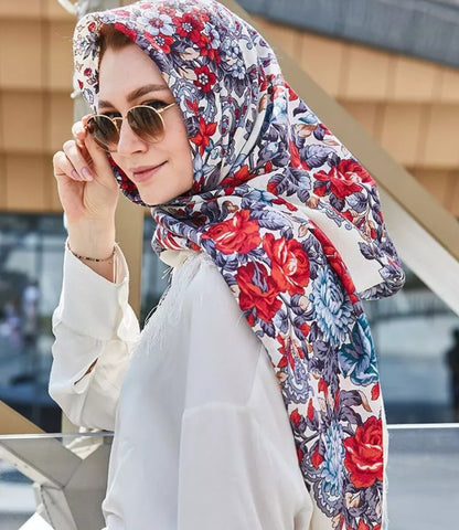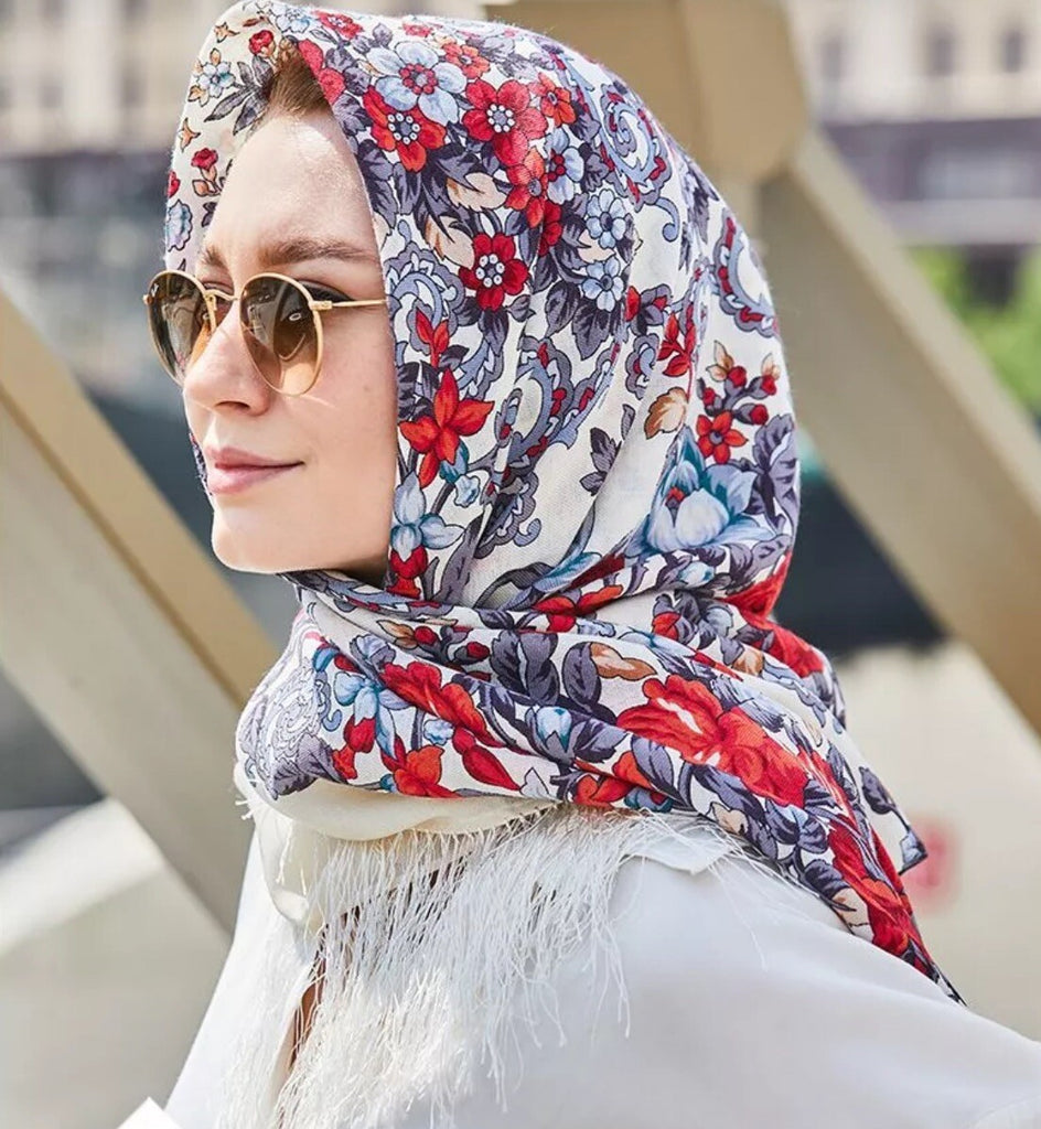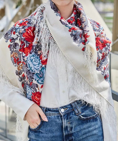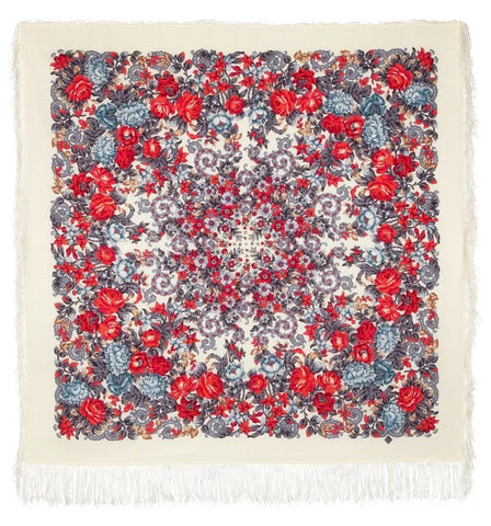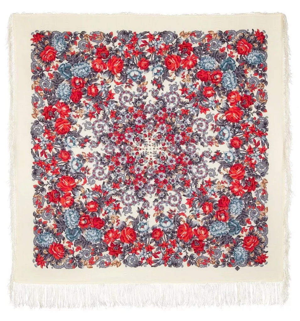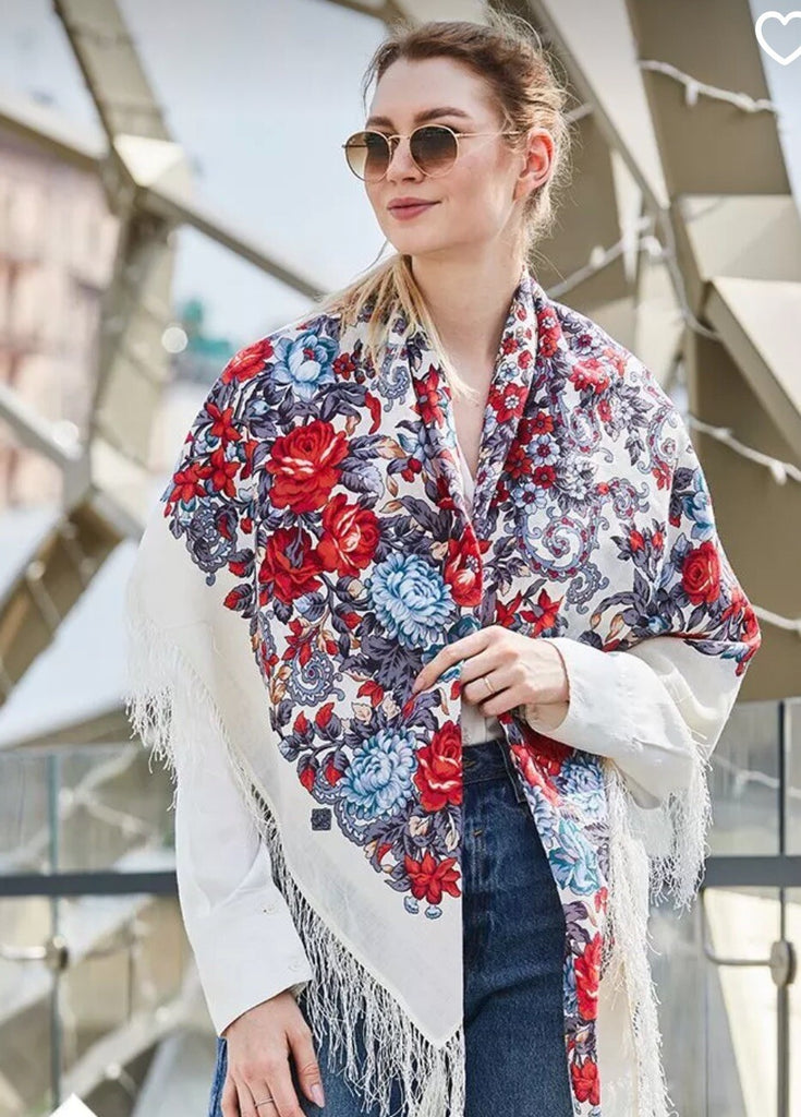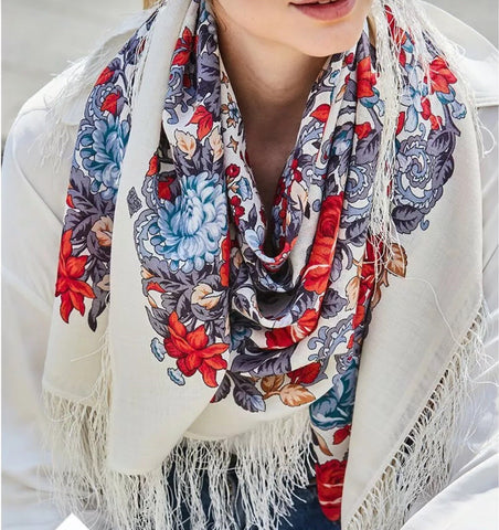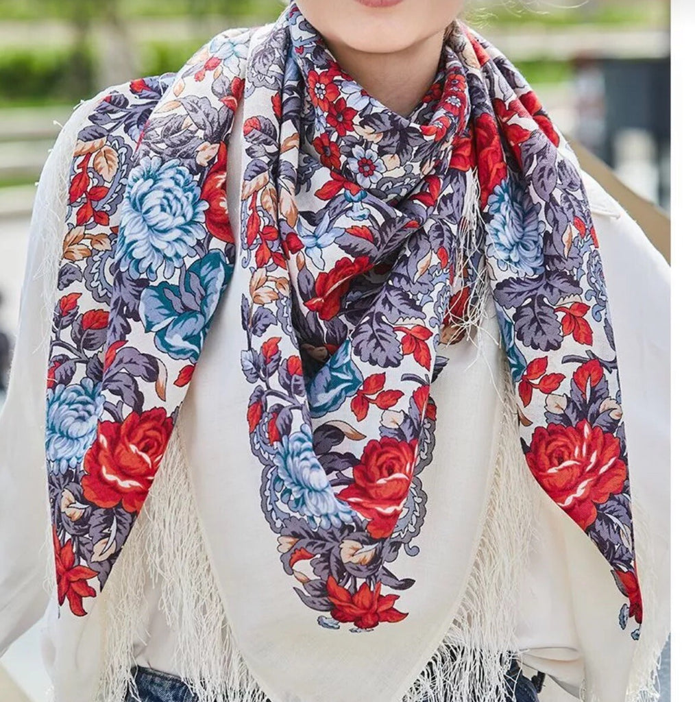 This scarf is a 49'' square made of 100% natural merino wool in a beautiful white, red, and blue floral pattern by the Russian brand Pavlovo Posad. It features leaves and flowers, making it a stylish accessory for women. With a dry clean only care instruction, this scarf is versatile and can be worn as a neck warmer in winter or as a stylish addition to your outfit in the summer, fall, and spring seasons. Perfect for adding a touch of Slavic elegance to any look.