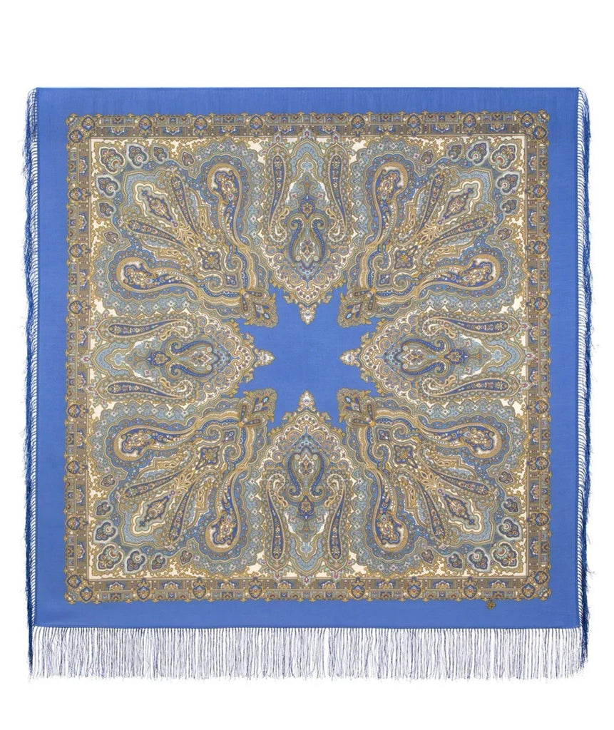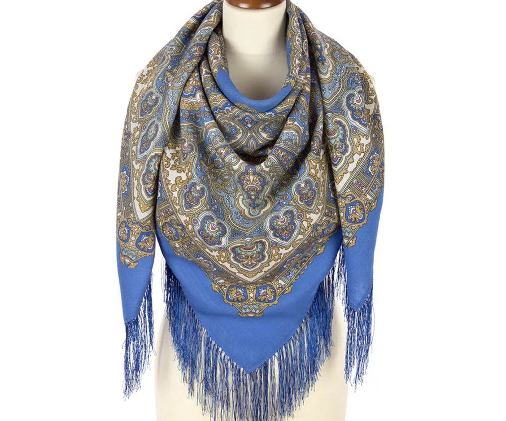 Wrap yourself in the warmth and elegance of the Pavlovo Posad 49” Scarf, a versatile piece that transcends seasons. Crafted from luxurious merino wool, this square wrapping shawl boasts a palette of blue and brown adorned with an herbal pattern that evokes the beauty of nature. The design features a sophisticated fringe, adding a touch of contemporary flair to this timeless accessory.