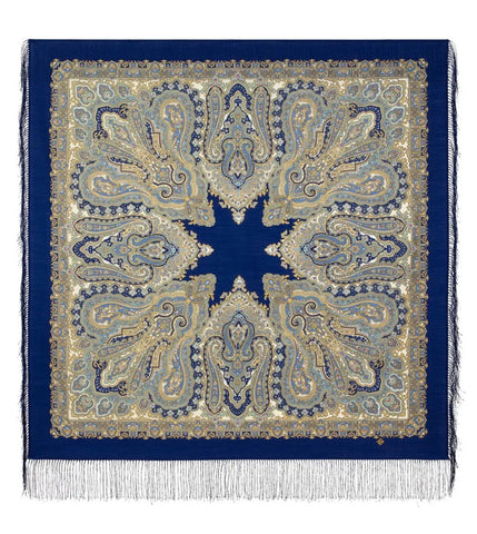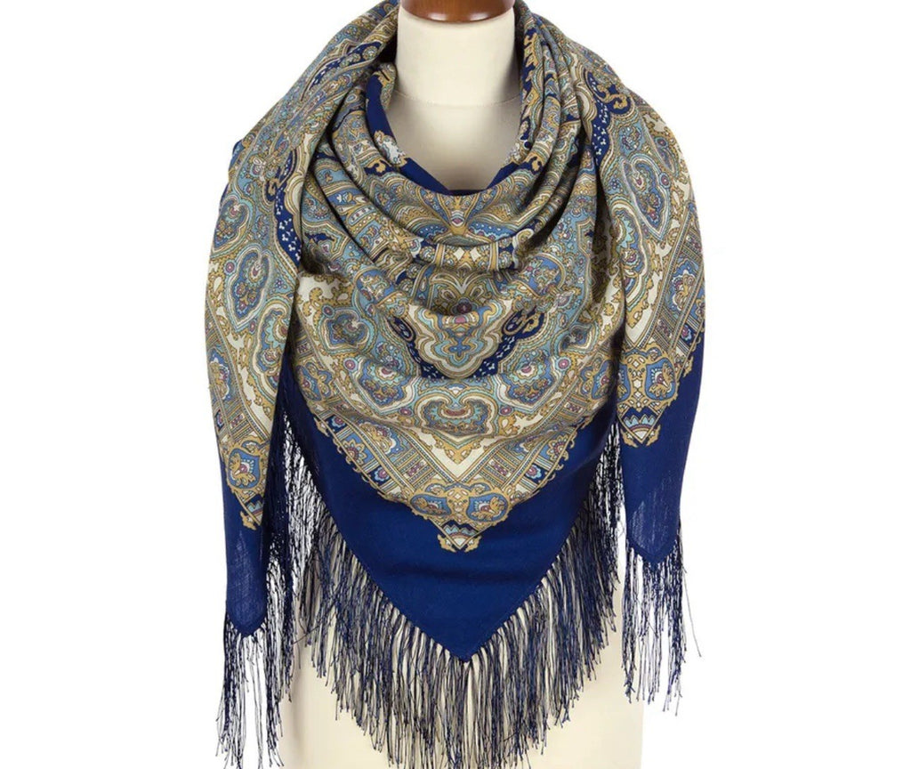 Wrap yourself in the cozy embrace of this Pavlovo Posad merino wool scarf, a versatile accessory that transcends seasons. With its vibrant mix of navy blue, light blue and yellow hues, this square scarf is adorned with a delicate herbal pattern featuring leaves and flowers that bring a touch of nature to any ensemble. The scarf's fringed accents add a rustic charm, making it an elegant statement piece.