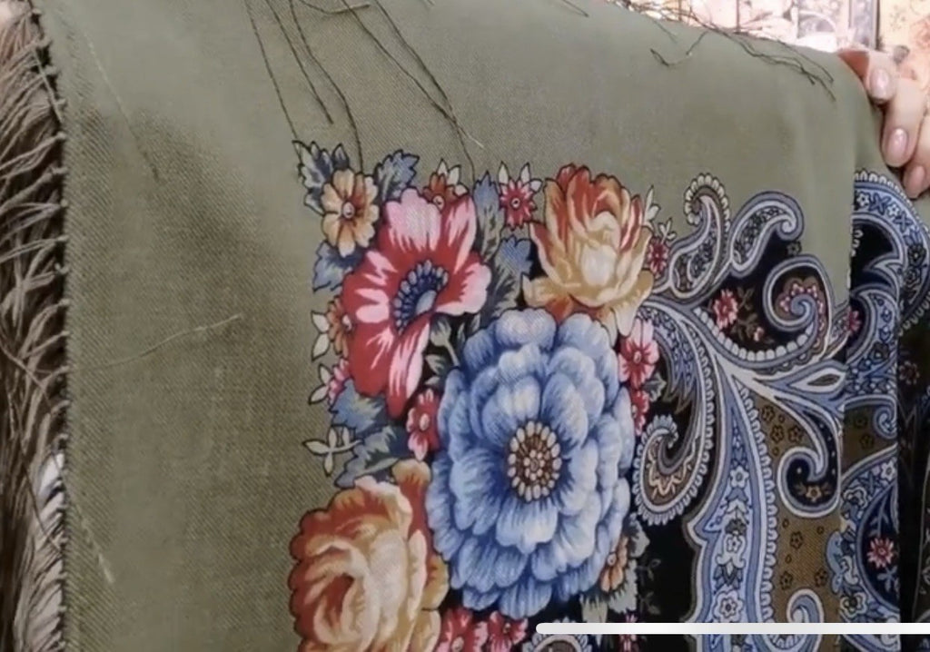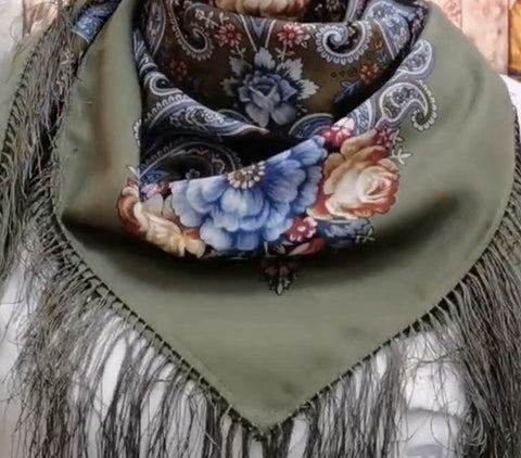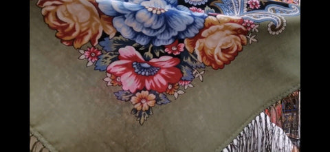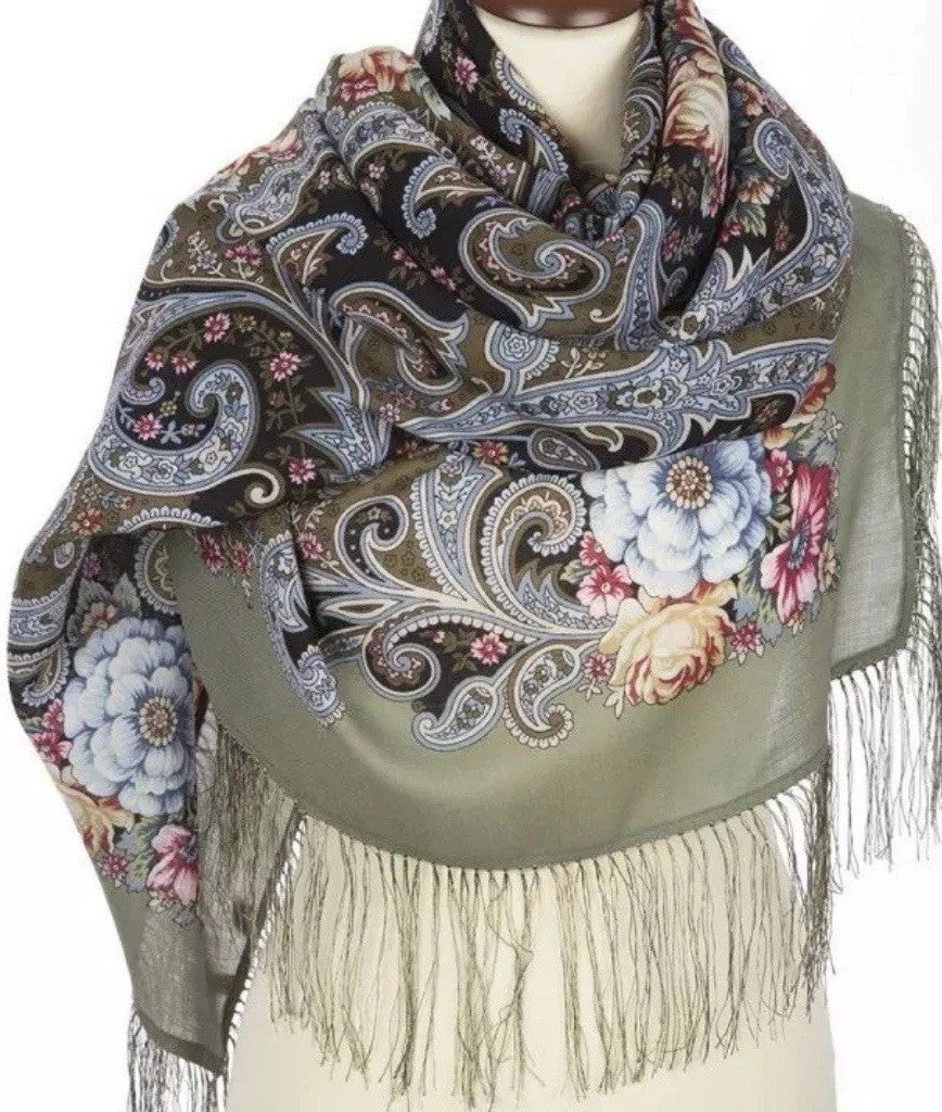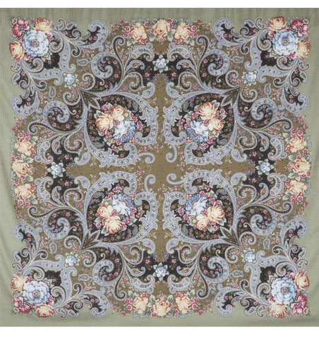 This 49” scarf square is a natural merino woolen green head shawl from the Pavlovo Posad brand, featuring a floral pattern with leaves and flowers. The scarf is a mix of dark grayish green, salad green, pink, and light blue colors, making it a versatile accessory for all seasons. Made of high-quality merino wool, this square scarf can be worn as a headscarf, shawl, neck warmer, or stole, adding a touch of nature-inspired elegance to any outfit. Designed in the Russian Federation, this merino wool dark khaki scarf embodies a blend of traditional and contemporary style with its intricate design and premium material. Perfect for those who appreciate Slavic culture, or as a thoughtful gift for anyone who performs traditional Russian folk dances. It makes a beautiful and fitting accessory for folk dance attire.