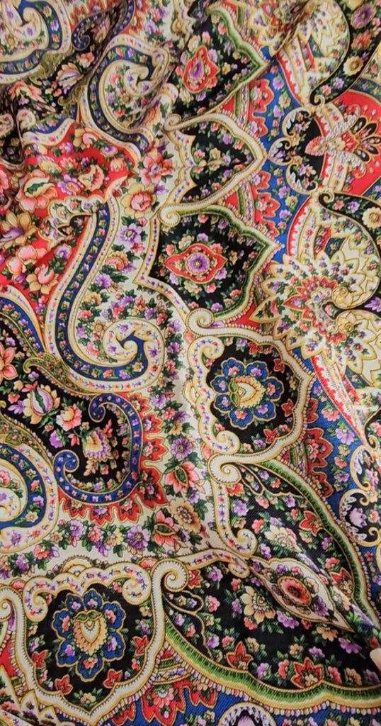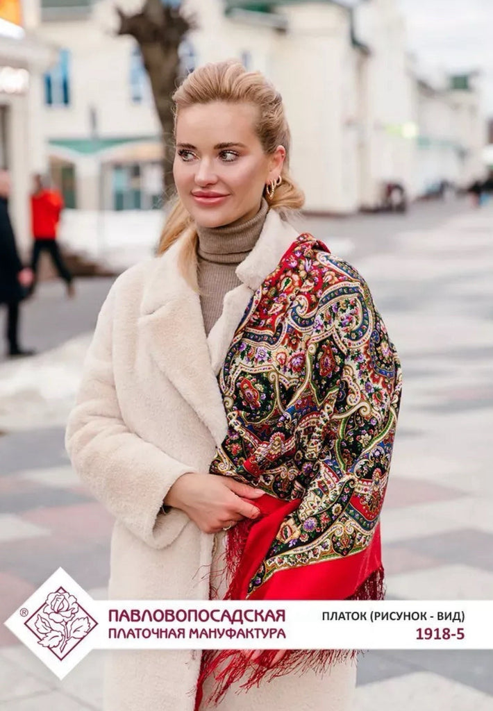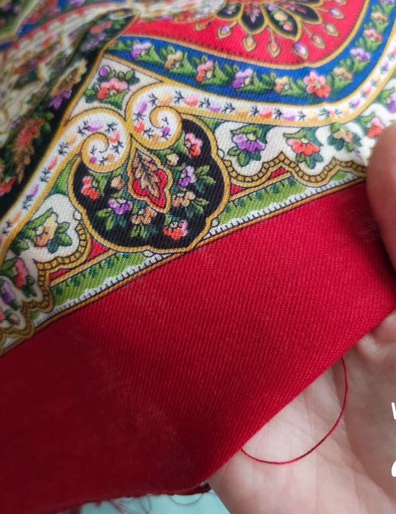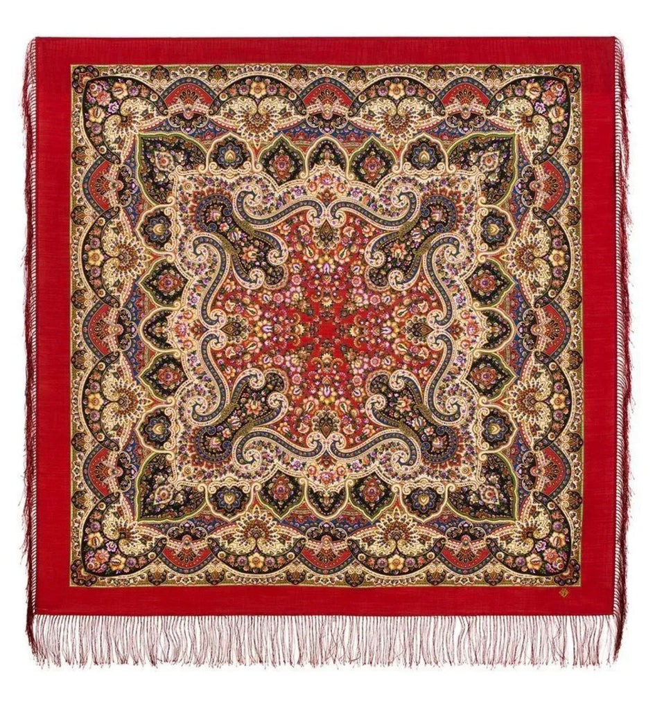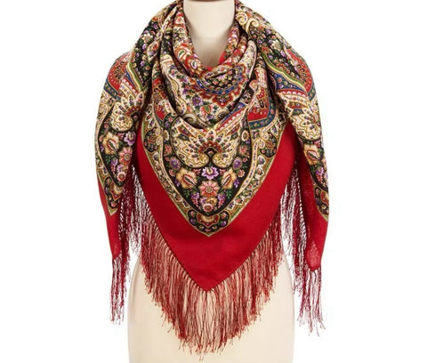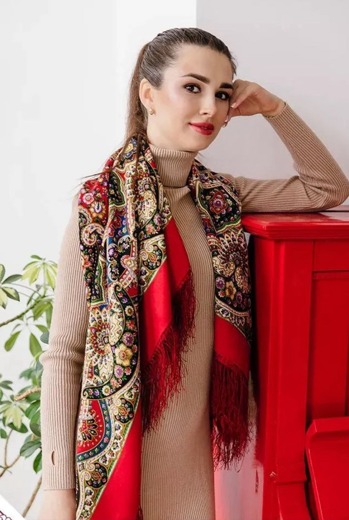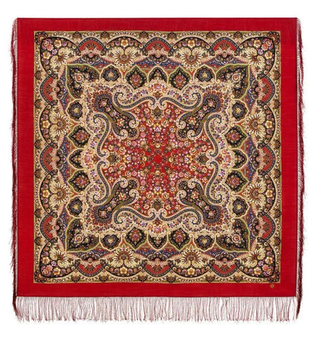 Wrap yourself in the warmth and elegance of the Pavlovo Posad 1918 scarf, a stunning representation of Russian craftsmanship. This 49-inch square scarf is crafted from luxurious merino wool, offering both comfort and durability. Its vibrant palette of red, green, beige, and purple is adorned with a captivating floral pattern, featuring leaves and flowers that evoke the essence of nature.