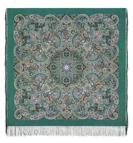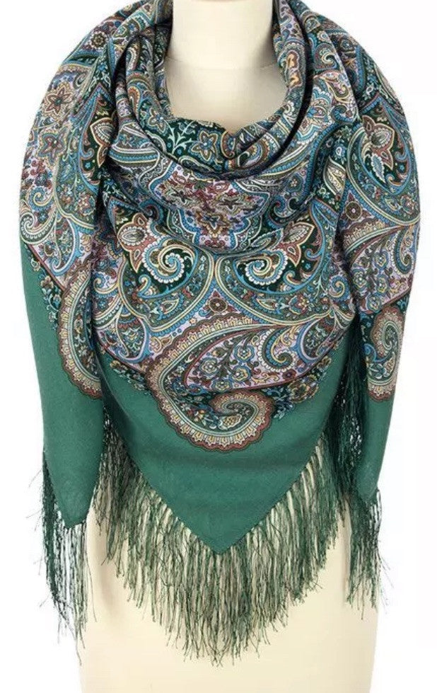 This authentic Pavlovo Posad square shawl is crafted from high-quality Merino wool in a vibrant green color with accents of beige, brown, and purple. The pattern features floral elements including leaves and flowers, giving it a nature-inspired theme. The scarf is adorned with fringe details, adding a touch of elegance. With its versatile design, this multifunctional scarf can be worn as a headscarf, shawl, neck warmer, or stole, making it a stylish accessory for all seasons. Crafted in the Russian Federation, this versatile accessory is ideal for all seasons, making it a stylish, soft and cozy addition to your wardrobe. Upgrade your spring style with our Scarves and Stoles from Pavlovo Posad, the famous Russian brand since the 19th century. With a dry clean only care instruction, this scarf is versatile and can be worn as a neck warmer in winter or as a stylish addition to your outfit in the summer, fall, and spring seasons. Perfect for adding a touch of modern elegance to any look.