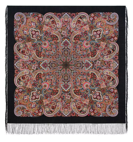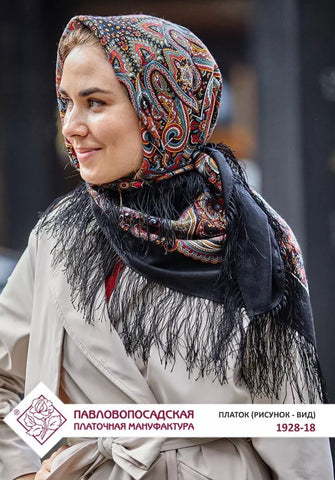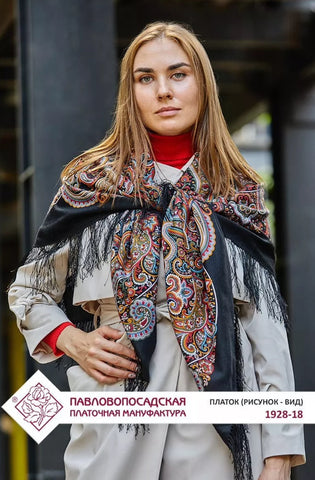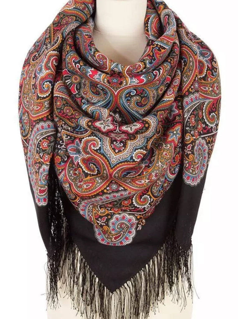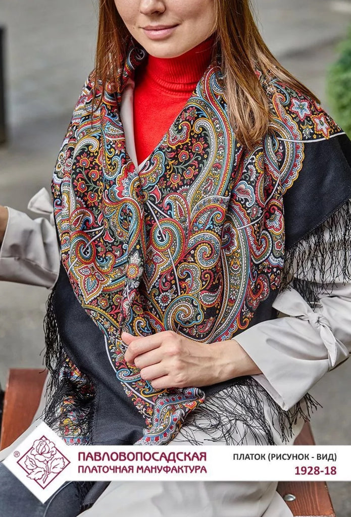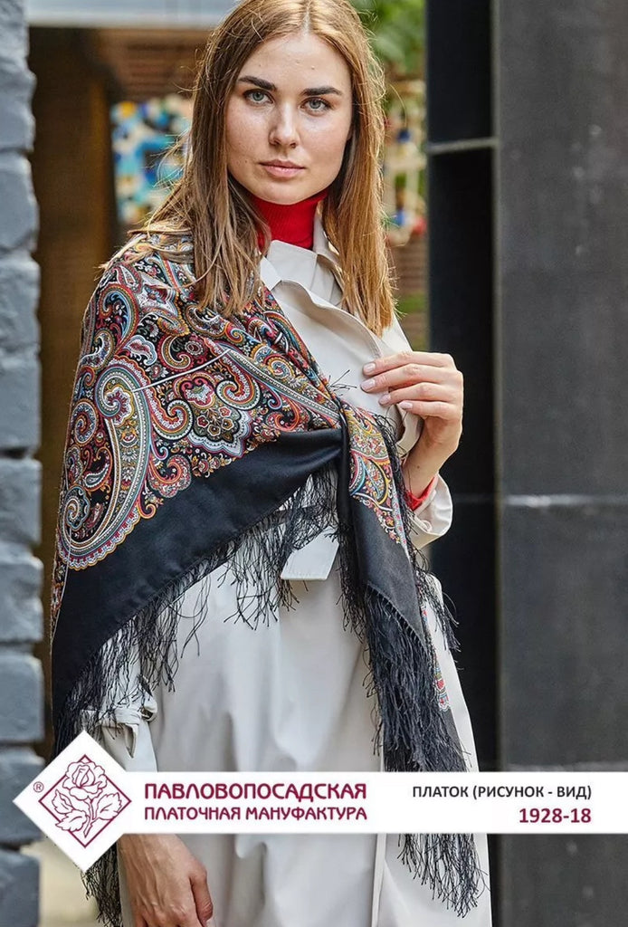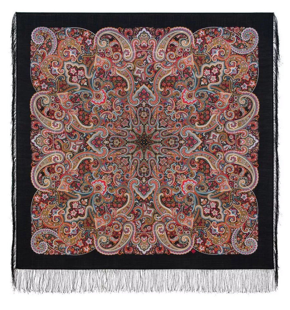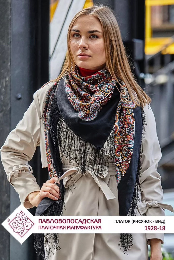 This Pavlovo Posad scarf is a 49" square shawl made from black and red natural merino wool with a floral pattern titled "Potselui Rusalki 1928-18". Featuring leaves and flowers, this scarf is designed with a nature theme and accented with fringe, suitable for winter, summer, fall, and spring seasons. The versatile scarf can be worn as a head scarf, shawl, neck warmer, or stole, and is crafted in the Russian Federation with a dry clean only care requirement. Crafted in the Russian Federation, this versatile accessory is ideal for all seasons, making it a stylish, soft and cozy addition to your wardrobe. Upgrade your spring style with our Scarves and Stoles from Pavlovo Posad, the famous Russian brand since the 19th century. With a dry clean only care instruction, this scarf is versatile and can be worn as a neck warmer in winter or as a stylish addition to your outfit in the summer, fall, and spring seasons. Perfect for adding a touch of modern elegance to any look.