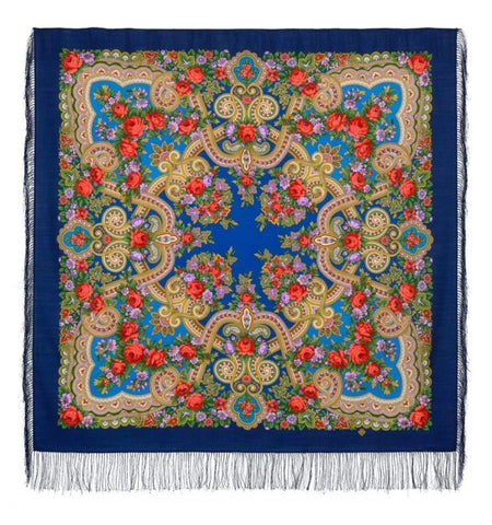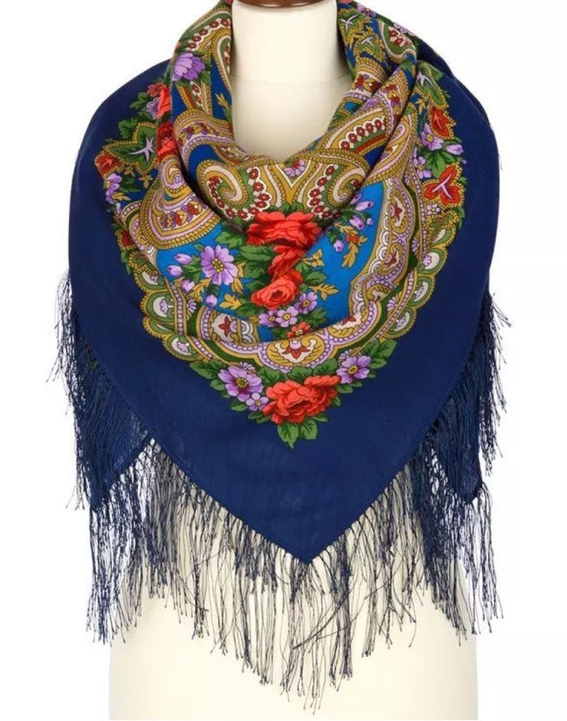 This 49" square blue shawl scarf by Pavlovo Posad well-known brand since 19th century features a beautiful floral pattern in green, red, and purple colors, with accents of fringe. Made from natural merino wool in the Russian Federation, this scarf is suitable for all seasons and can be worn in various ways like a head scarf, shawl, neck warmer, or stole. The design is inspired by nature, with leaves and flowers adding a touch of herbal charm to the accessory. The item is recommended for dry clean only to maintain its quality. Each intricate design