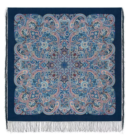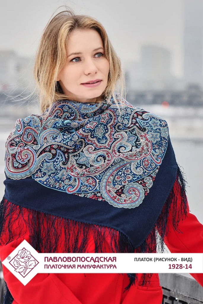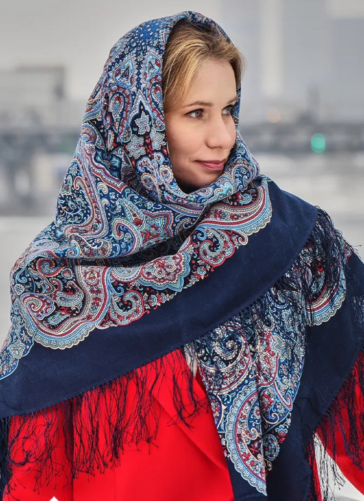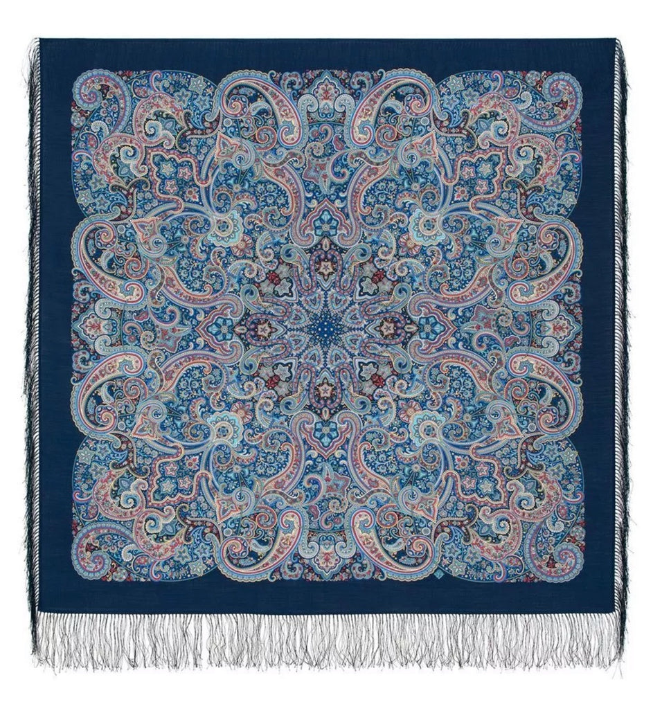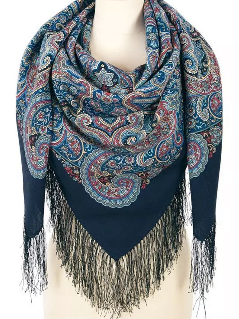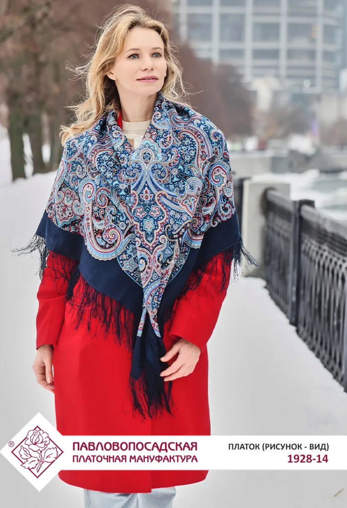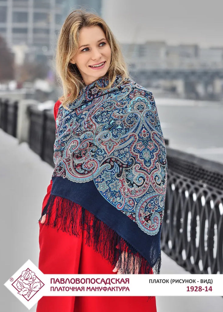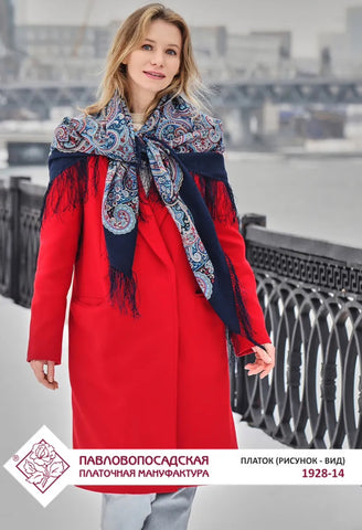 This 49" square shawl scarf by Pavlovo Posad features a floral pattern in blue, red, white, and beige colors, made from high-quality Merino wool. The design, titled "Potselui Rusalki 1928-14," is adorned with herbal patterns, giving it a nature-themed style. With accents like fringe, this versatile scarf can be worn as a headscarf, shawl, neck warmer, or stole, suitable for various seasons. The scarf is recommended for dry clean only. Crafted in the Russian Federation, this versatile accessory is ideal for all seasons, making it a stylish and cozy addition to your wardrobe. Upgrade your spring style with our Scarves and Stoles from Pavlovo Posad, the famous Russian brand since the 19th century. With a dry clean only care instruction, this scarf is versatile and can be worn as a neck warmer in winter or as a stylish addition to your outfit in the summer, fall, and spring seasons. Perfect for adding a touch of modern elegance to any look.