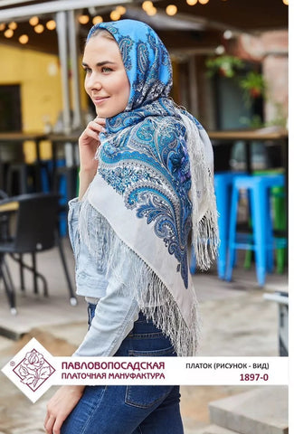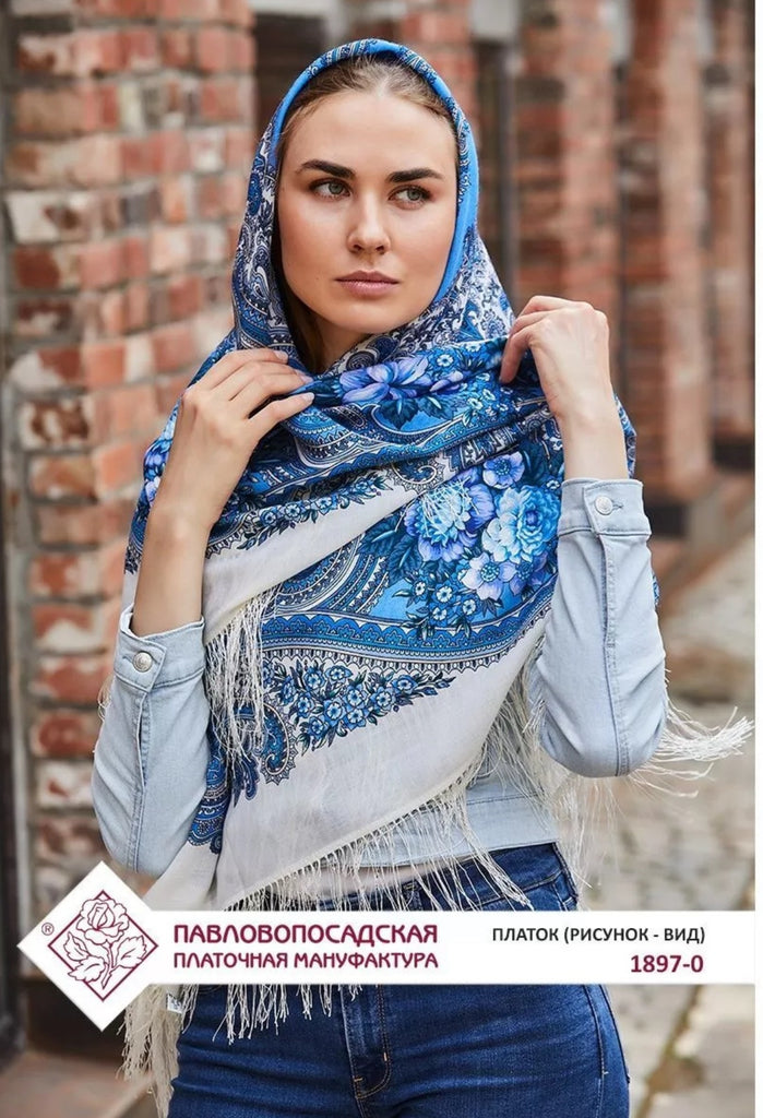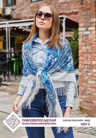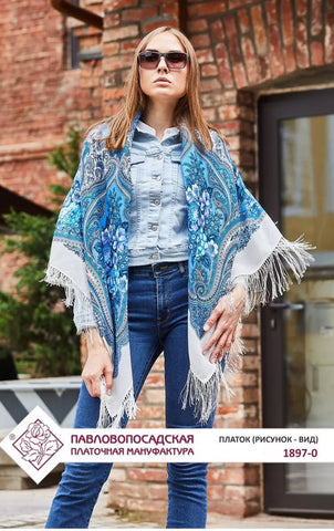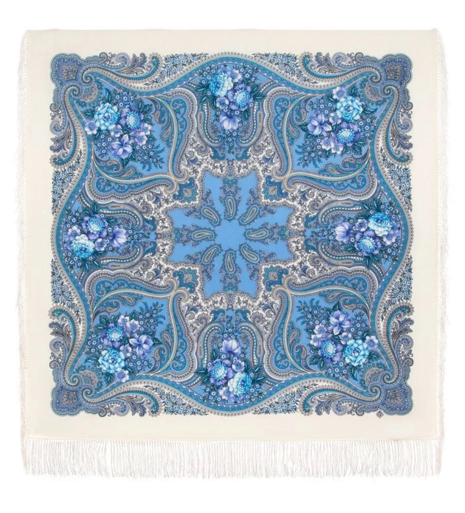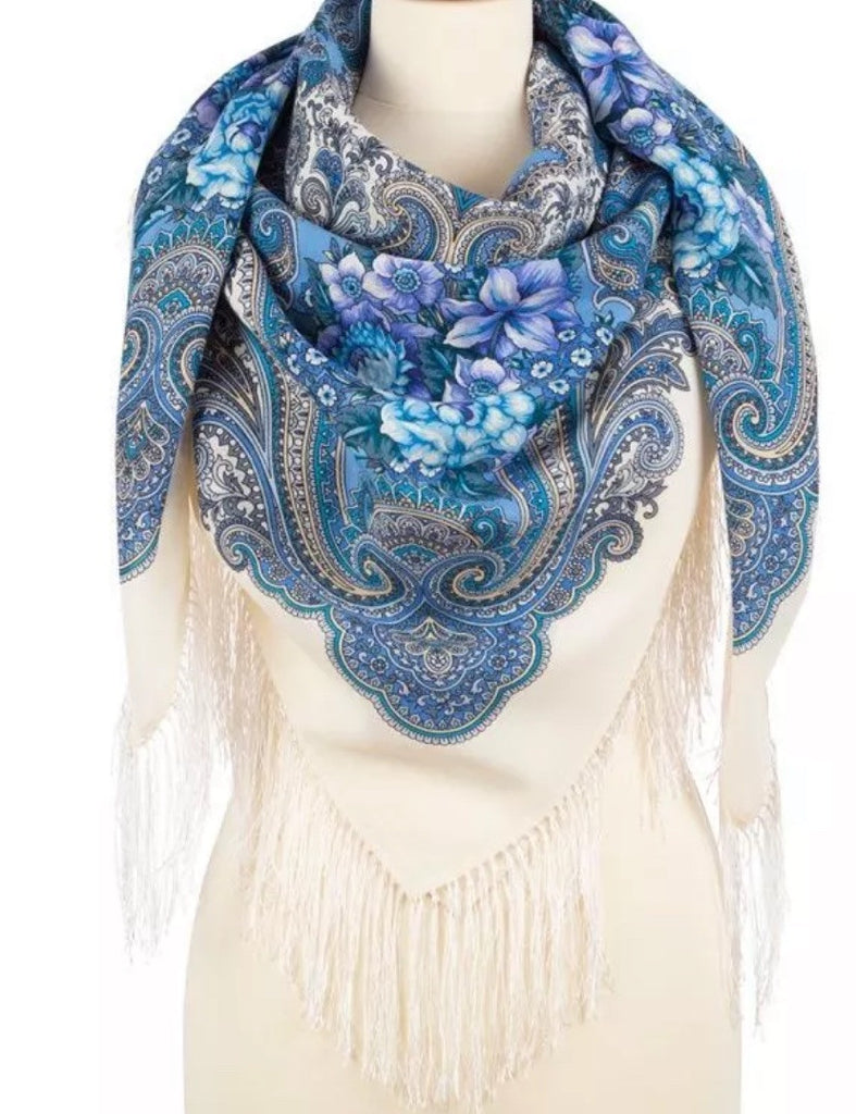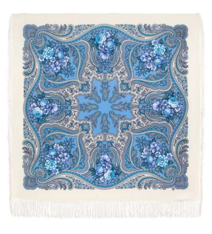 This 49" square shawl is made from natural merino wool in light blue, white, purple, and beige colors, featuring a floral pattern called "Kostry Oseni 1897-0" by Pavlovo Posad. The scarf is adorned with fringe accents and is suitable for winter, summer, fall, and spring seasons. It can be styled as a head scarf, shawl, neck warmer, hijab, or stole, making it a versatile accessory for women who appreciate nature-inspired designs. Hand wash only. Made in the Russian Federation. This scarf, crafted with natural merino wool, is incredibly soft and cozy, making it the perfect gift for any occasion. Whether it's for Mother's Day, a birthday, or an anniversary, this scarf is sure to bring warmth and comfort to your loved one. Made with care and expertise, it's a must-have for any wardrobe.