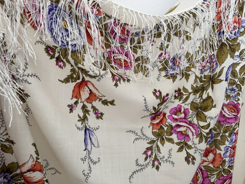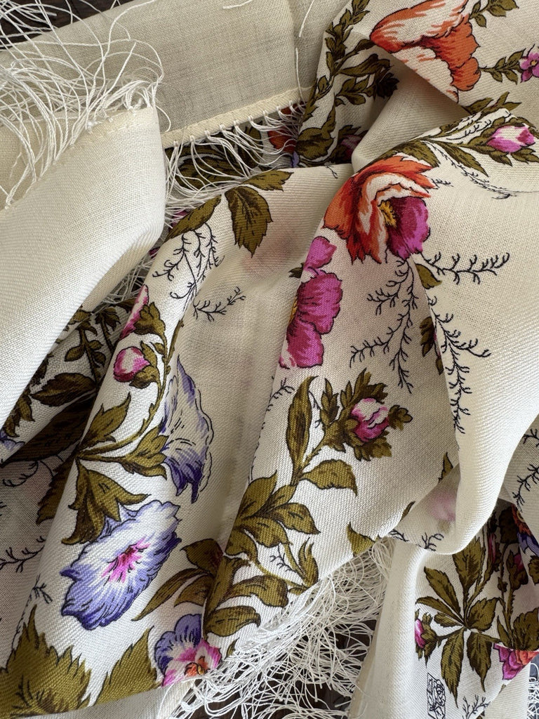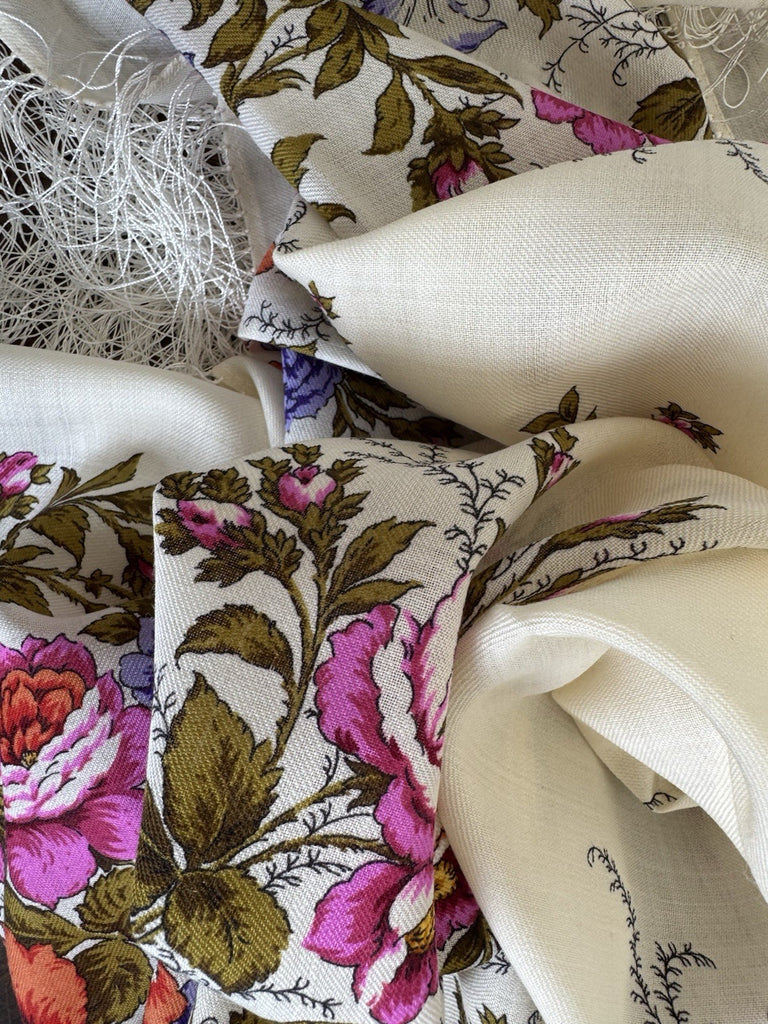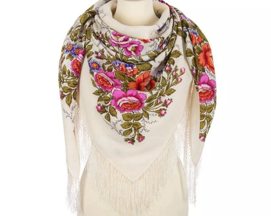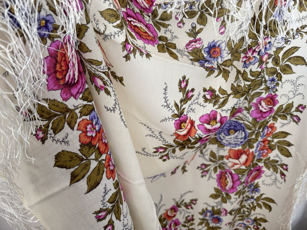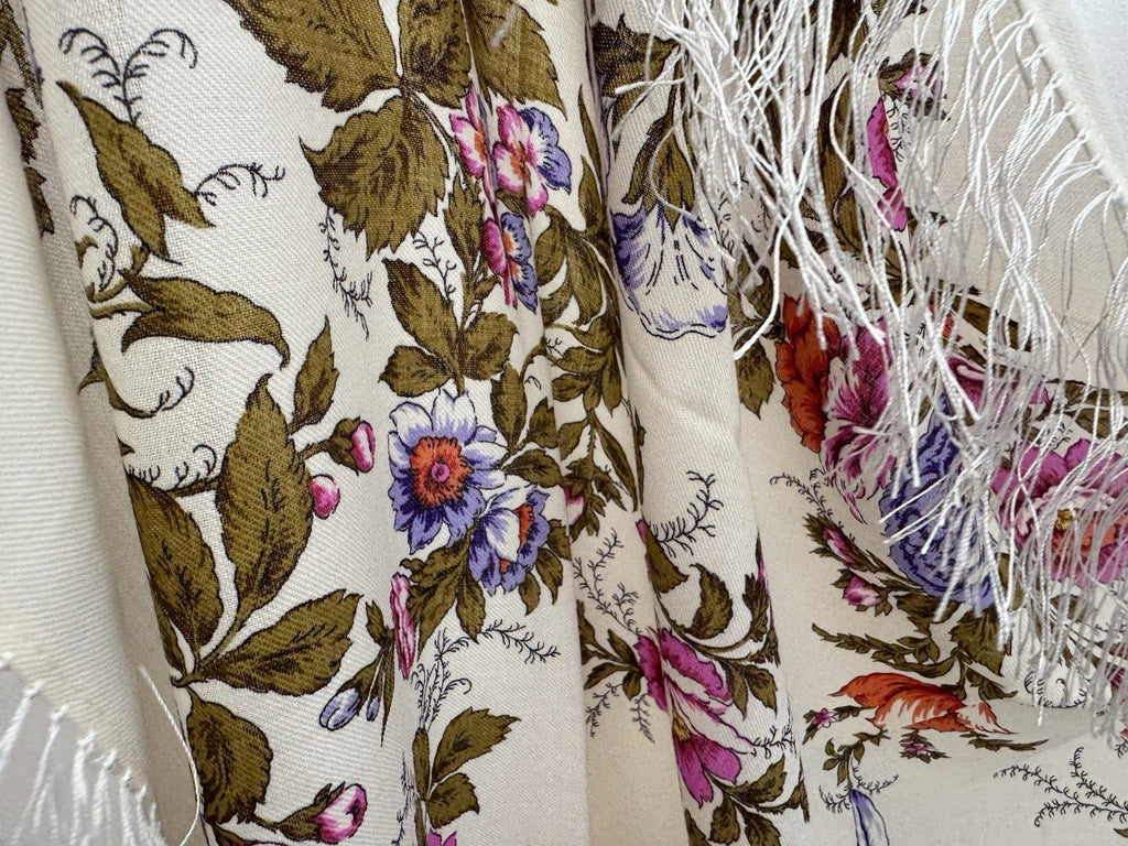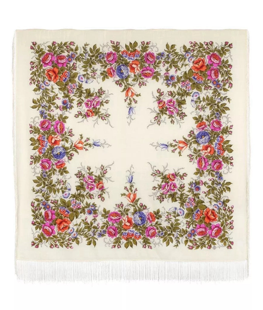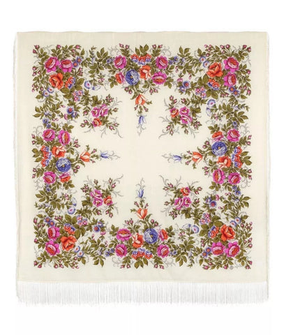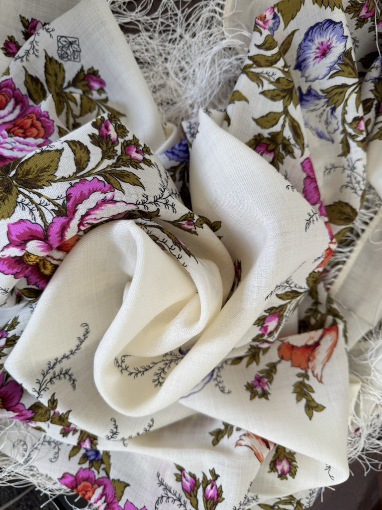 Wrap yourself in the timeless elegance of the Pavlovo Posad 1594 scarf, a versatile piece that transcends seasons. Crafted from the finest merino wool, this square-shaped scarf features a breathtaking floral pattern with an array of colors including milky white, green, pink, orange, and purple, showcasing a delicate harmony of leaves and flowers that evoke the freshness of nature.