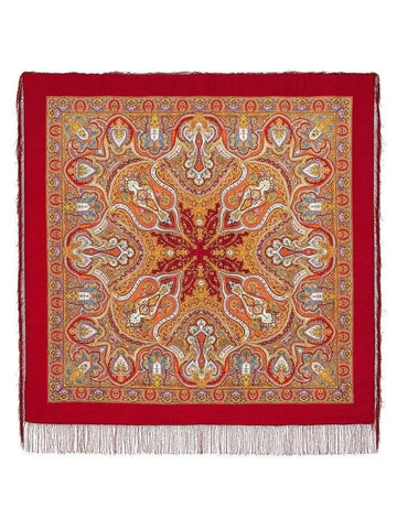 The 57'' big square scarf by Pavlovo Posad is a luxurious accessory made from 100% merino wool in red with Russian traditional patterns. This versatile shawl can be worn in various ways such as a scarf, palantine, neck warmer, or hijab, making it perfect for any season. The vintage-inspired design with fringe accents adds a touch of bohemian flair to any outfit, making it a must-have addition to any woman's wardrobe. Made in the Russian Federation, this warm and soft shawl combines style and practicality effortlessly.