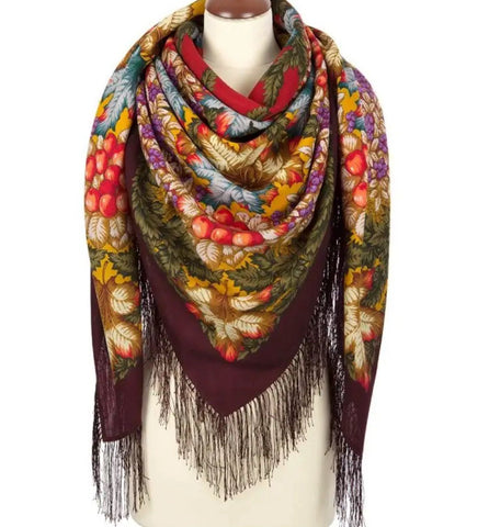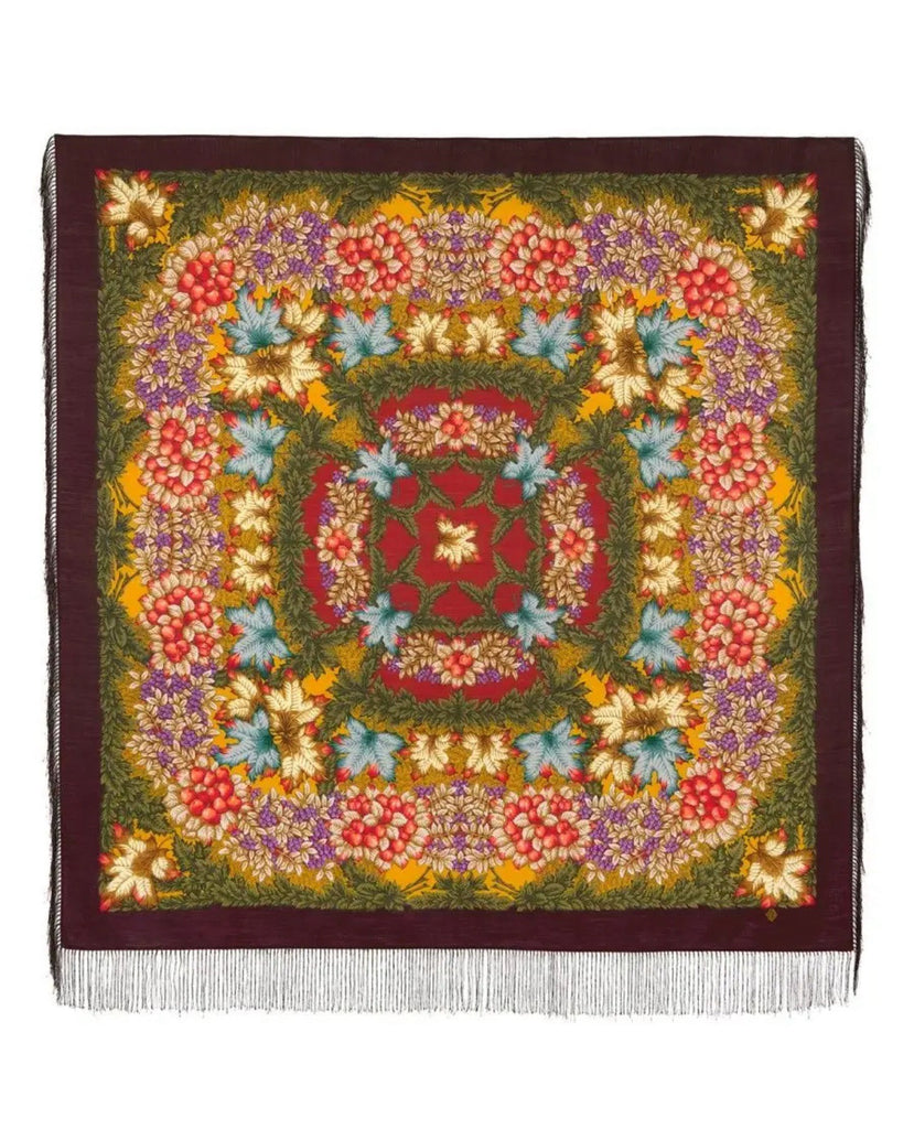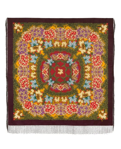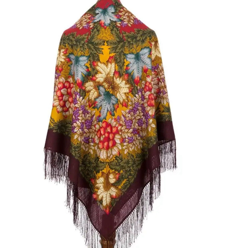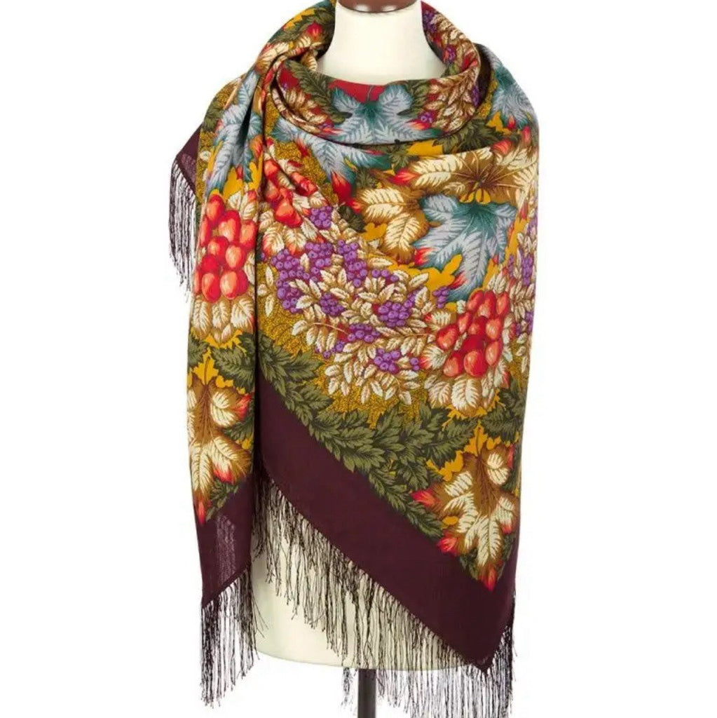 Wrap yourself in the warmth and elegance of the Pavlovo Posad 57'' square scarf, a versatile accessory that complements any outfit. Crafted from 100% merino wool, this scarf is a cozy choice for any season, featuring a vibrant blend of dark brown, green, purple, orange, and turquoise tones. Its herbal autumn themed pattern adorned with leaves and fruits brings a touch of nature-inspired beauty to your look.