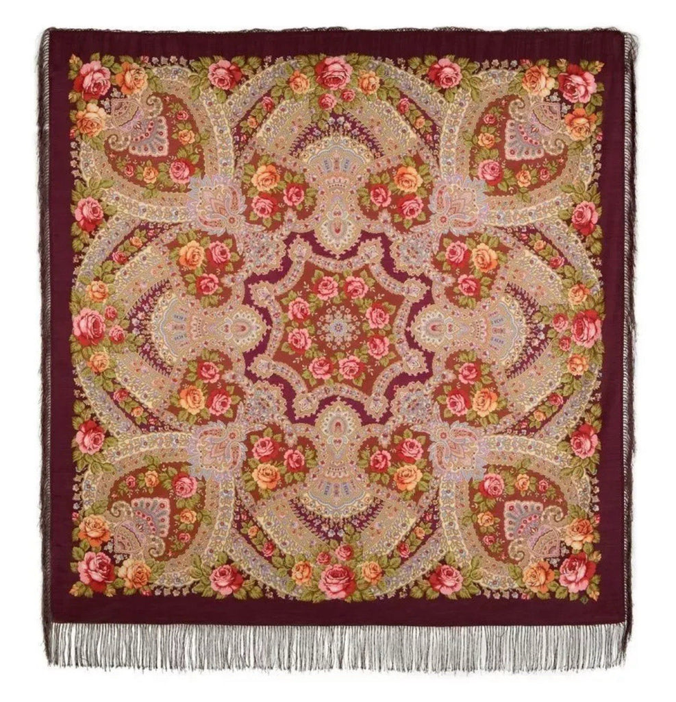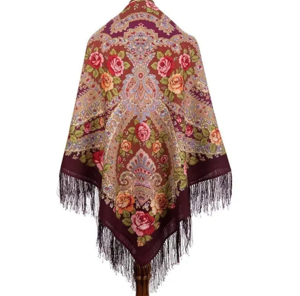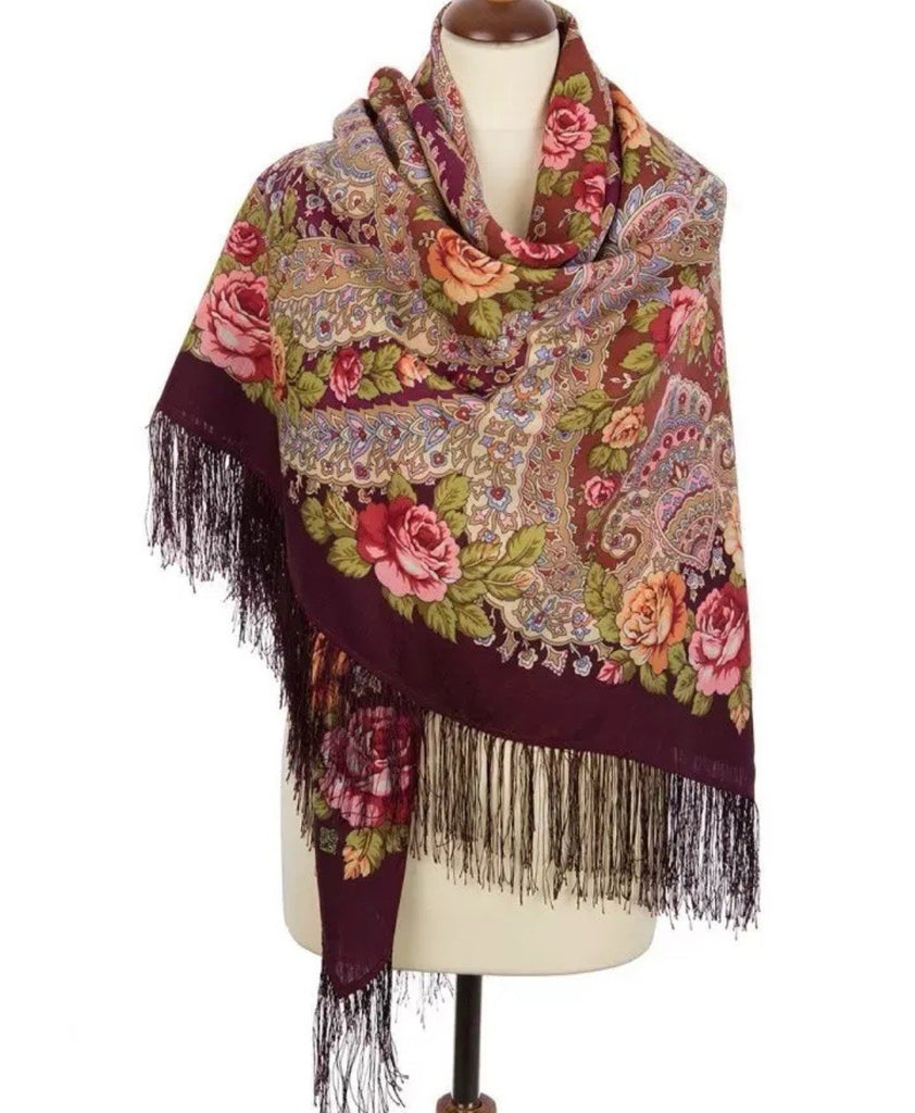 The 57'' big square scarf by Pavlovo Posad is a luxurious accessory made from 100% merino wool in dark red with floral pattern featuring large rose flowers and green leaves. This versatile shawl can be worn in various ways such as a scarf, palantine, neck warmer, or hijab, making it perfect for any season. The vintage-inspired design with fringe accents adds a touch of bohemian flair to any outfit, making it a must-have addition to any woman's wardrobe. Made in the Russian Federation, this warm and soft shawl combines style and practicality effortlessly.