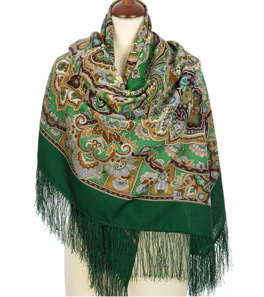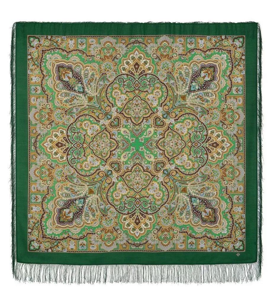 This 57'' big square shawl made from 100% merino wool in green and gold colors with herbal pattern is a versatile and stylish accessory for women. The scarf features bohemian ornamentation and fringe accents, making it perfect for various occasions like winter, summer, fall, and spring. This cozy and soft shawl can be worn as a neck warmer, scarf, dupatta, or shoulders wrap, offering a unique and trendy look. Made by Pavlovo Posad in the Russian Federation, this high-quality garment is designed to add a touch of elegance to any outfit.